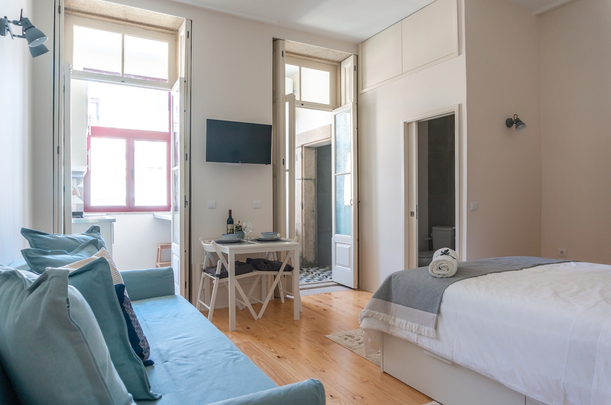 Studio located on the 3rd floor and facing the front of the building, with a comfortable double bed, fully equipped kitchen, bathroom, and balcony. Located in the historical centre of Porto, just 10mn walking from the city main square, Avenida dos Aliados, and Ribeira, near the river Douro. With a 5 minutes walk you'll find the biggest shopping street of the city, Santa Catarina, where Majestic Café is located as well.