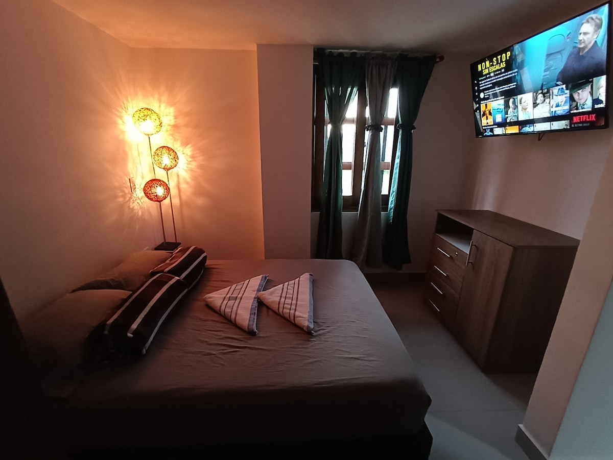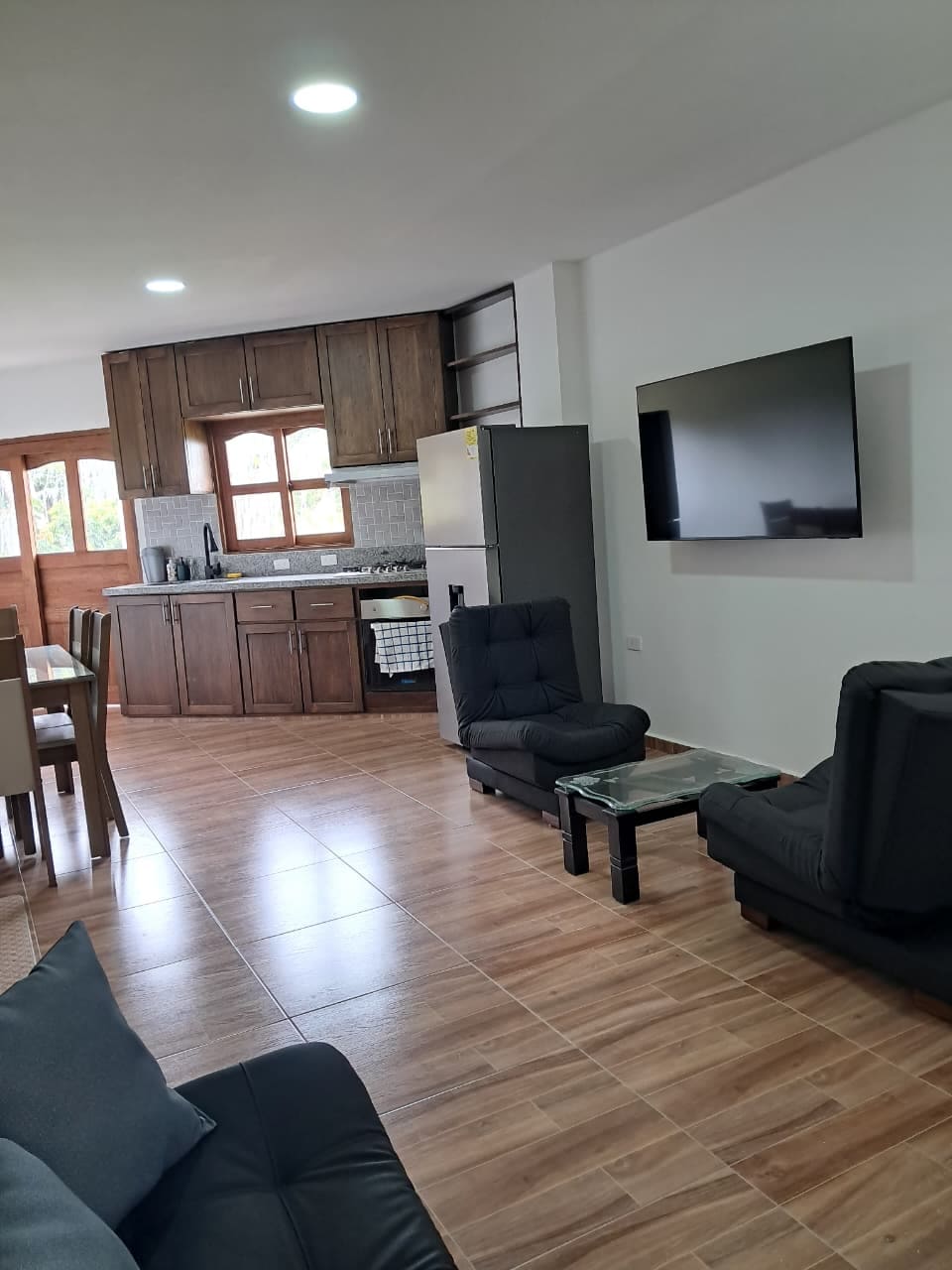 Apartamento Nuevo a 3 cuadras del parque principal, bonito y amplio. Excelente vista a la naturaleza desde los balcones de las habitaciones. Lugar tranquilo e ideal para parejas o familias. Equipado con cocina, dos baños y 3 alcobas cada una con cama doble y televisión. Servicio de WiFI y parqueadero gratis..
