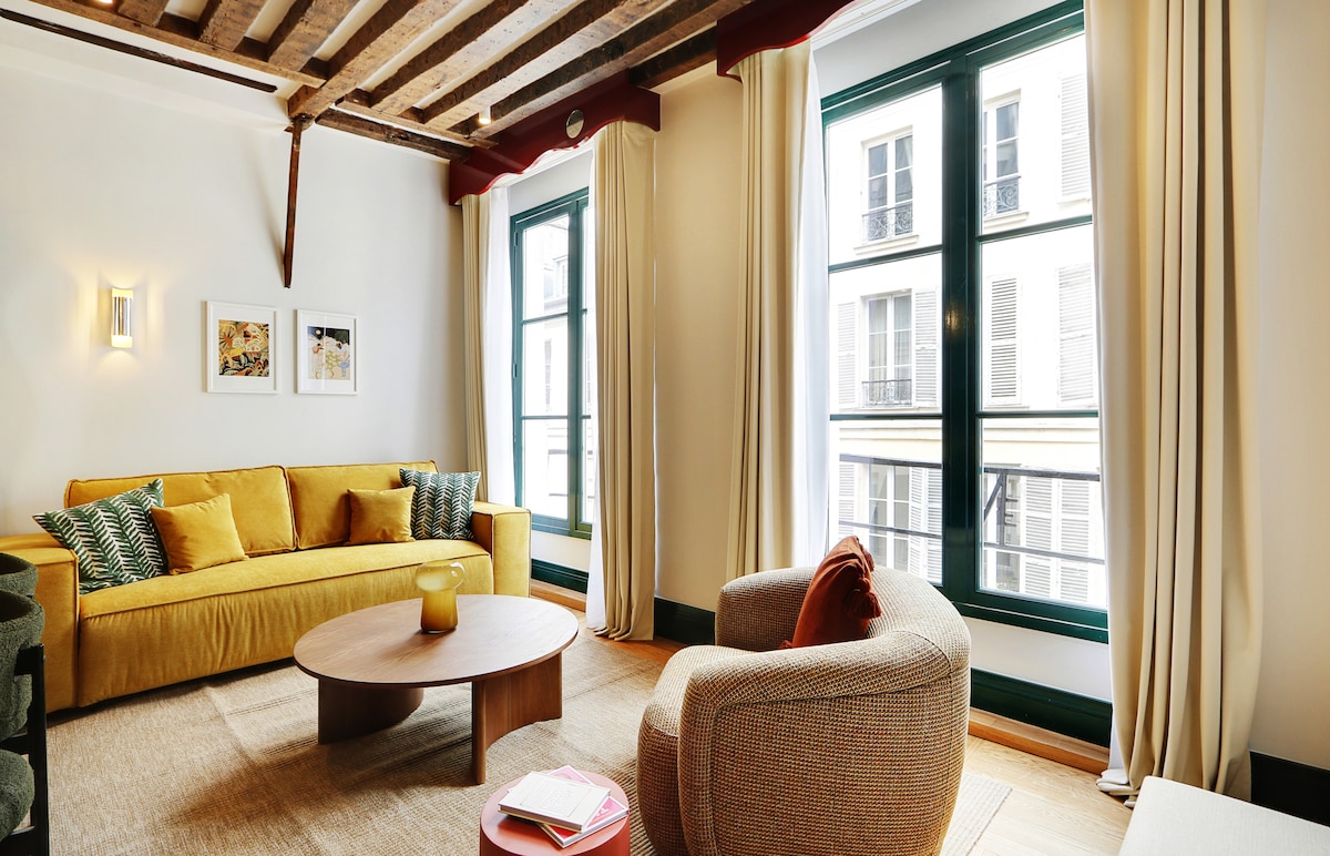 This spacious, 1 BR apartment is housed in a 17th century Latin Quarter building in one of the most desirable neighborhoods in Paris. Steps away from the Seine River, its romantic quais, historic cafes, shops, restaurants and monuments, it is quietly separated from the bustle by two picturesque courtyards. Close to so many sites that drew you to Paris. Its high wood beam ceilings and floor to ceiling windows give it a light, airy amazingly quiet place to relax.