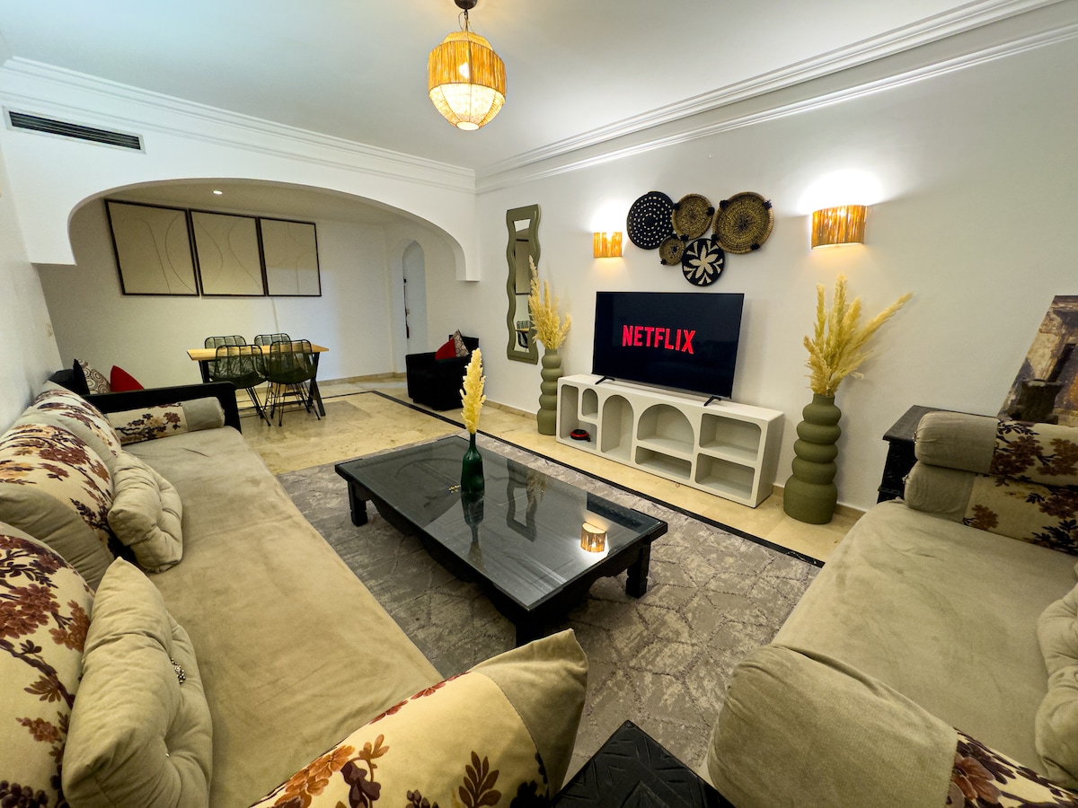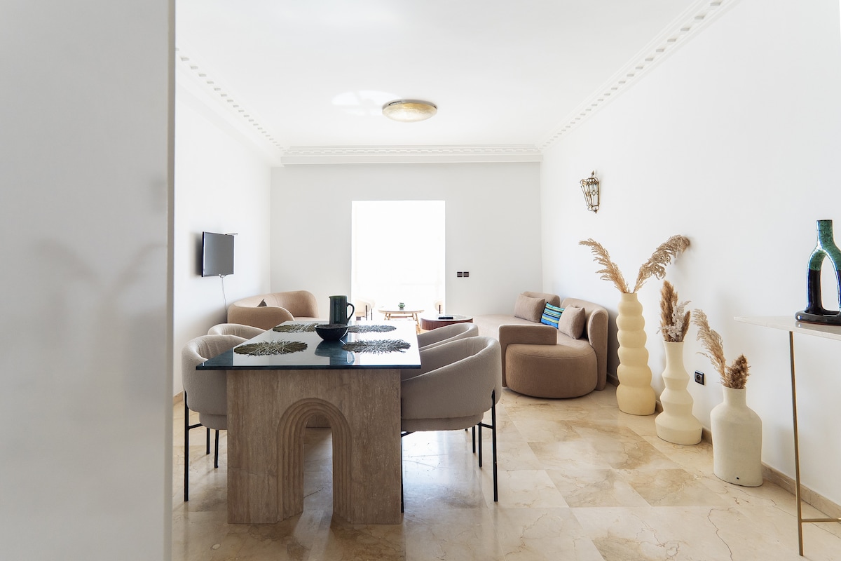 Welcome to your Marrakech escape! This stylish 2-bedroom apartment is nestled between the iconic Majorelle Garden and the vibrant heart of Guéliz—the perfect spot for exploring the city in comfort. Enjoy your morning coffee or a sunset drink on one of two private terraces, soak up the sun by the shared swimming pool, and unwind in a modern, fully equipped space with AC, fast Wi-Fi, and smart TV. 2 min walk to Majorelle, 7 min to Gueliz and 20 min walk to Jemaa el-Fnaa POOL IS CLOSED ON MONDAY