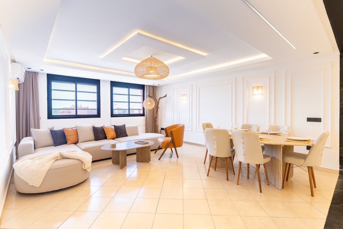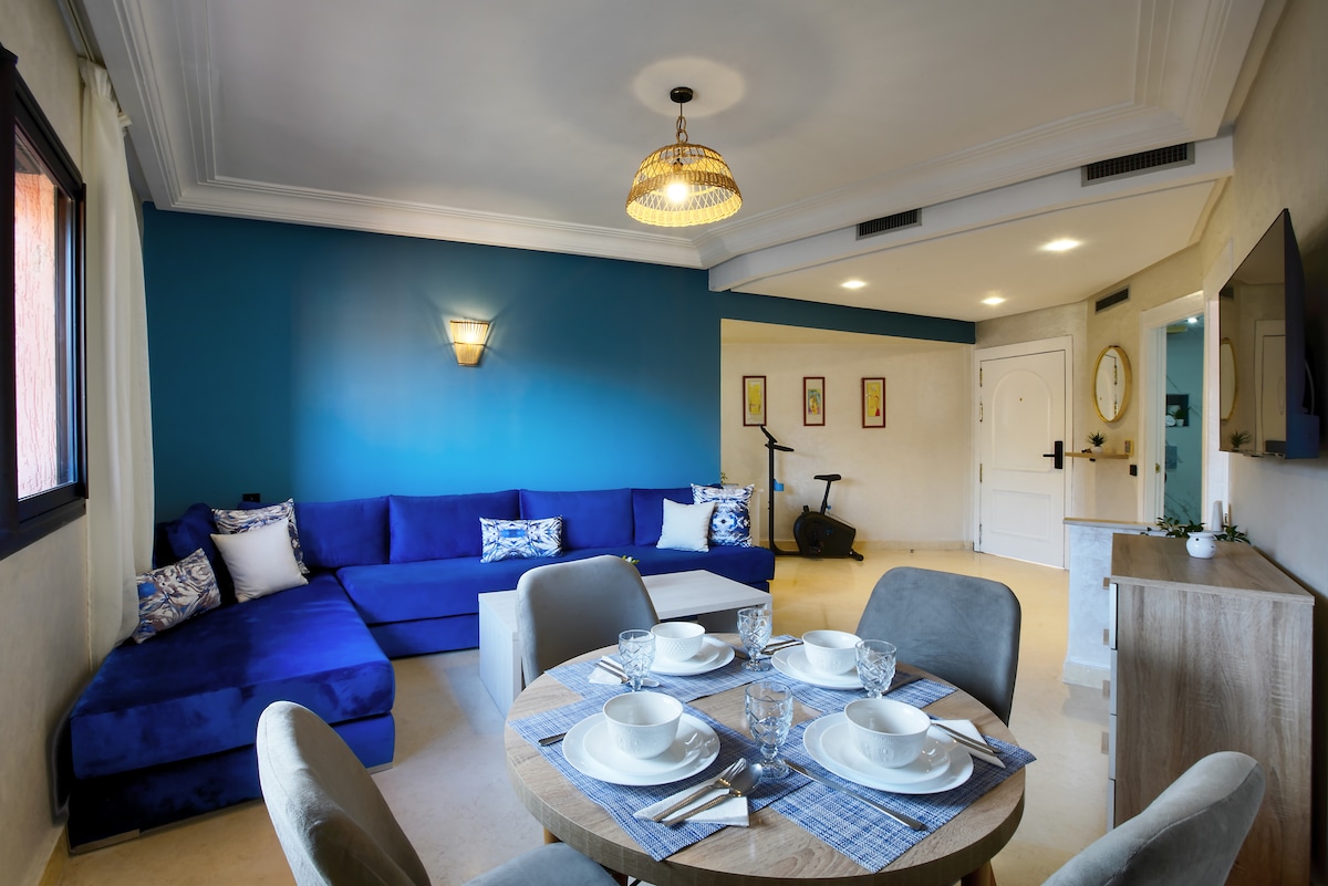Appartement ensoleillé, chaleureux et hors pair, idéalement situé dans une résidence neuve en plein coeur du quartier mythique, Guéliz, avec une vue sur le Mall Carré Eden, très bien asservi et proche de toutes commodités. Moderne avec une touche marocaine, il est aménagé pour que vous vous sentiez chez vous, c'est le point de départ idéal pour profiter des merveilles de Marrakech ainsi que pour y séjourner pour un voyage d'affaire. Il est également parfaitement adéquat au télétravail.