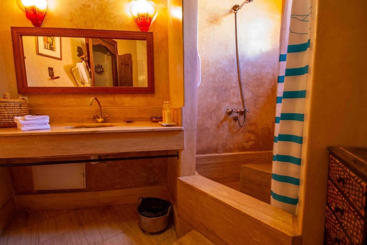 Stay in a charming riad in the heart of Marrakech Medina! Our riad features 5 authentic rooms, each with a private bathroom. This listing is for one room only, and you can choose your favorite upon arrival. Enjoy a unique mix of Moroccan tradition and modern comfort, perfect for couples, solo travelers, or friends. Just steps away from souks, monuments, and local restaurants, it’s the ideal base for an unforgettable Marrakech experience.