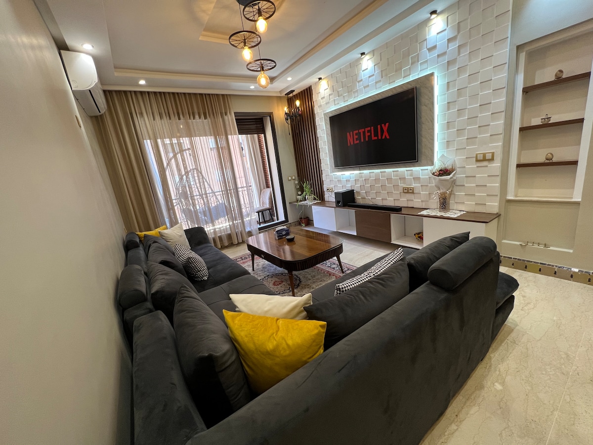Un appartement élégant et neuf situé dans l'un des quartiers les plus sécurisés proche de toutes les commodités (boucherie, épicerie, snacks et restaurants), à 2min de la faculté de médecine, et à deux pas de Guéliz (5min) * Doté d'un salon moderne luxueux. * Une TV 50 avec chaines satellite, Netflix, Youtube... * FIBRE OPTIQUE à 100mbps. * Une cuisine entièrement équipée. * Une chambre spacieuse avec terrasse. * Climatisation centralisée. * Immeuble très propre avec parking sous sol privé.
