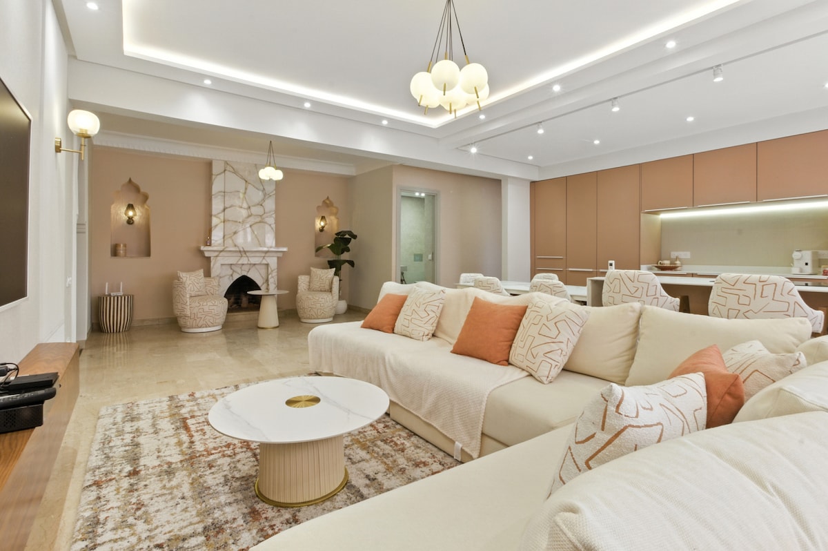 Expérience immersive dans un appartement-galerie contemporaine. Parfaitement situé dans le Triangle d’Or festif, 15 min à pied de la médina. Cet appartement très haut de gamme de 140m2 lumineux et cosy. À deux pas des palaces emblématiques (Mamounia, Sofitel, Casino) Résidence de prestige avec piscine. Idéal jusqu'a 5 voyageurs, il offre 2 chambres, 3 terrasses, 2 salles de bain et 3 WC. Entre ambiance branchée et animée, une expérience unique au cœur de Marrakech vous attend.