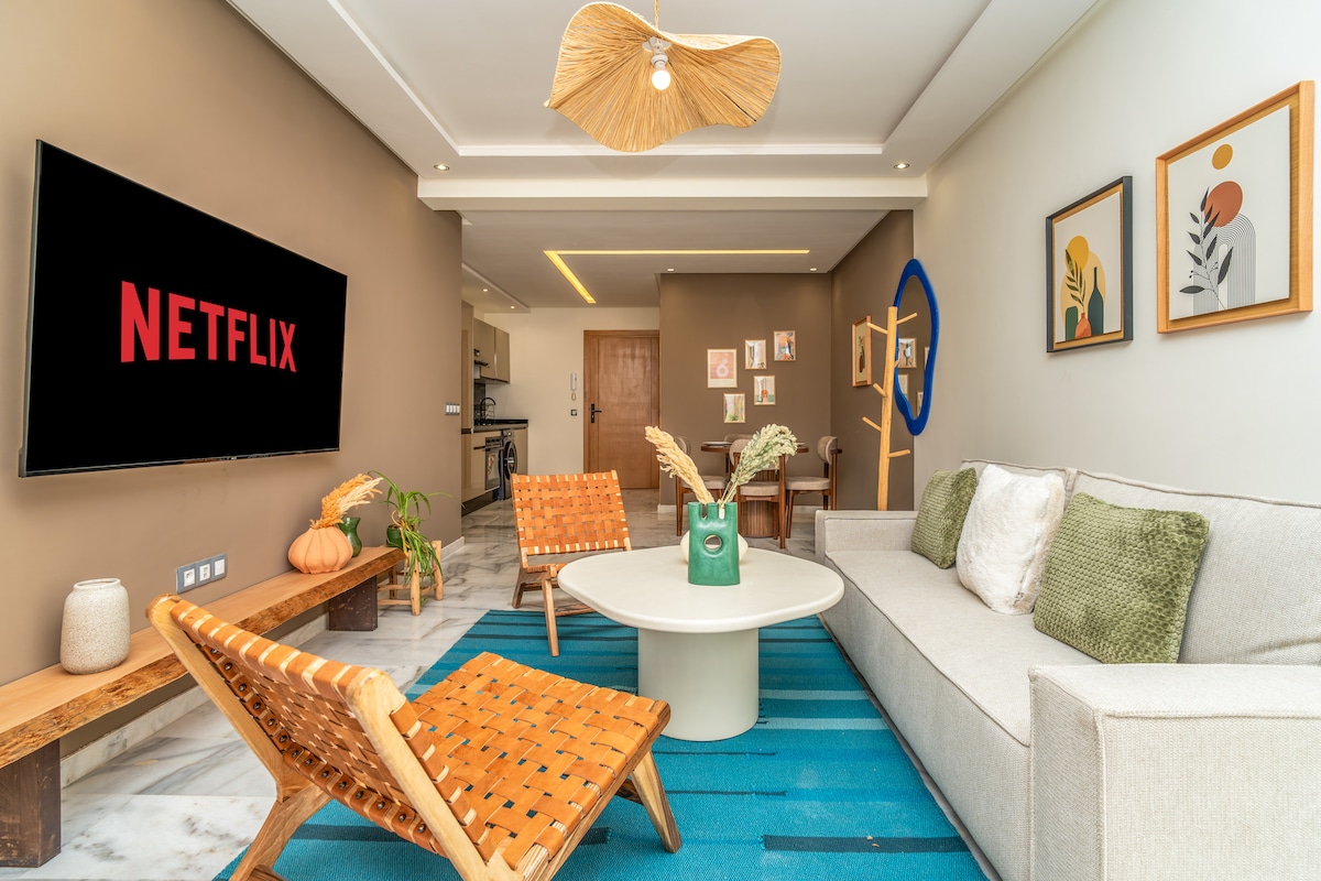 ✨ Modern 1BR Near Majorelle | Balcony & Wi-Fi Bright and stylish 1-bedroom apartment designed for comfort and a seamless guest experience. Relax in a living room with Moroccan touches, smart lighting, TV, dining area, and a fully equipped kitchen with coffee machine and washer. The bedroom features a TV and ensuite bathroom. Enjoy a private balcony with seating for two. Located in a secure residence in central Guéliz, just minutes from cafés, shops, transport, and Majorelle Garden. 🌴