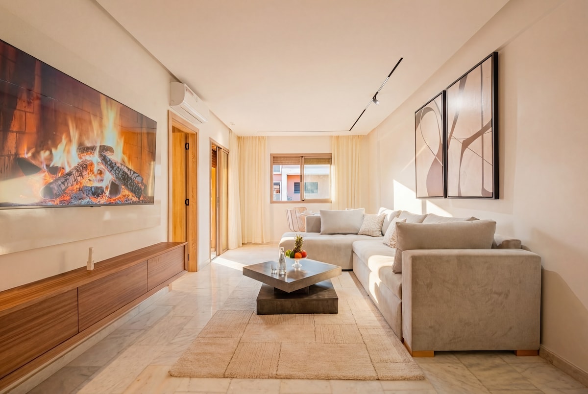 Séjournez en plein cœur de Marrakech dans notre appartement 2 chambres et 2 salles de bain. Profitez d'Une literie Simmons haut de gamme, WiFi haut débit (fibre optique) et d'une décoration moderne avec un bassin privé. Cuisine entièrement équipée, baignoire élégante, et douche italienne. À quelques pas de la place Jemaa el-Fna, du Plazza, et du Carré Eden. La piscine n’est pas chauffée. NB: Les couples marocains non mariés ne sont pas autorisés.