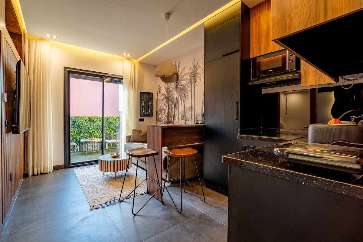 Bienvenue au PALACE SUITES I, un havre moderne au cœur de Guéliz. Profitez d’une chambre élégante avec placard, home cinéma et Netflix, d’un salon design avec TV 65’’ IPTV, d’une cuisine entièrement équipée, d’une salle de bain complète et d’une terrasse communicante offrant une vue magnifique. À seulement 2 minutes à pied de la gare et de la Marrakech Plaza, vivez une expérience alliant luxe, confort et détente absolue. 🌇✨