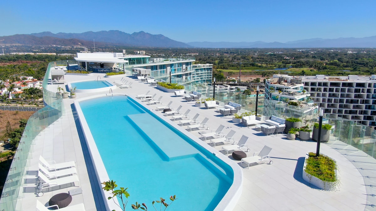 Relax in Maritima Playa, exclusive tropical paradise characterized by luxury and comfort with completely panoramic views that will allow you to wrap yourself in the calm of the ocean and enjoy the Pacific breeze that Riviera Nayarit offers. Luxury amenities: - Large private beach with seating area and lounges, two large pools and 2 small pools for kids, full service restaurant bar, paddle courts and business center - Best rooftop with 3 pools, gym and in-house spa, bar and lounges