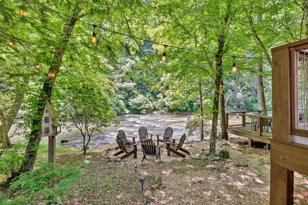 Riverfront cabin near Blue Ridge with hot tub, porch swing bed, fire pit, fireplace and 2 king beds on the Cartecay River across from 2000+ acre forest with hiking trails. Just over an hour from the Atlanta, GA or Chattanooga, TN airport and 5 min to downtown Ellijay or 30 min from downtown Blue Ridge. Wineries 10-15 min away! Fishing, kayaking, tubing, hiking, zip lining, biking, wineries/ vineyards, orchards, shopping and dining await you or just relax on the porch and listen to the river!