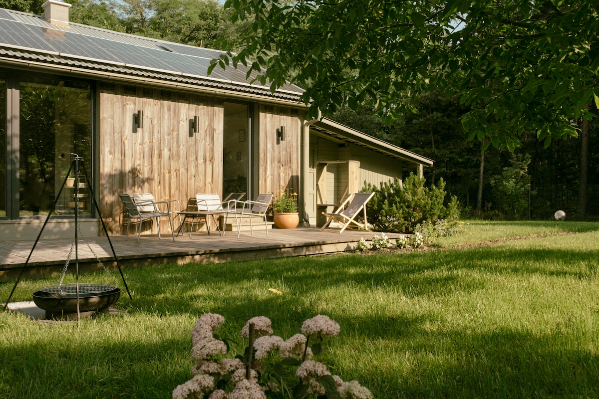 Nowoczesny domek położony w lesie oferuje idealne warunki do wypoczynku na łonie natury. Zaprojektowany w minimalistycznym stylu, z dużymi przeszkleniami, zapewniającymi piękne widoki na las. Domek wyposażony jest we wszystkie niezbędne udogodnienia, takie jak kominek, w pełni wyposażona kuchnia oraz łazienka. Na zewnątrz znajduje się taras z miejscem do grillowania oraz las, gdzie można odpocząć i obserwować dziką przyrodę. To idealne miejsce dla osób poszukujących spokoju i bliskości z naturą.