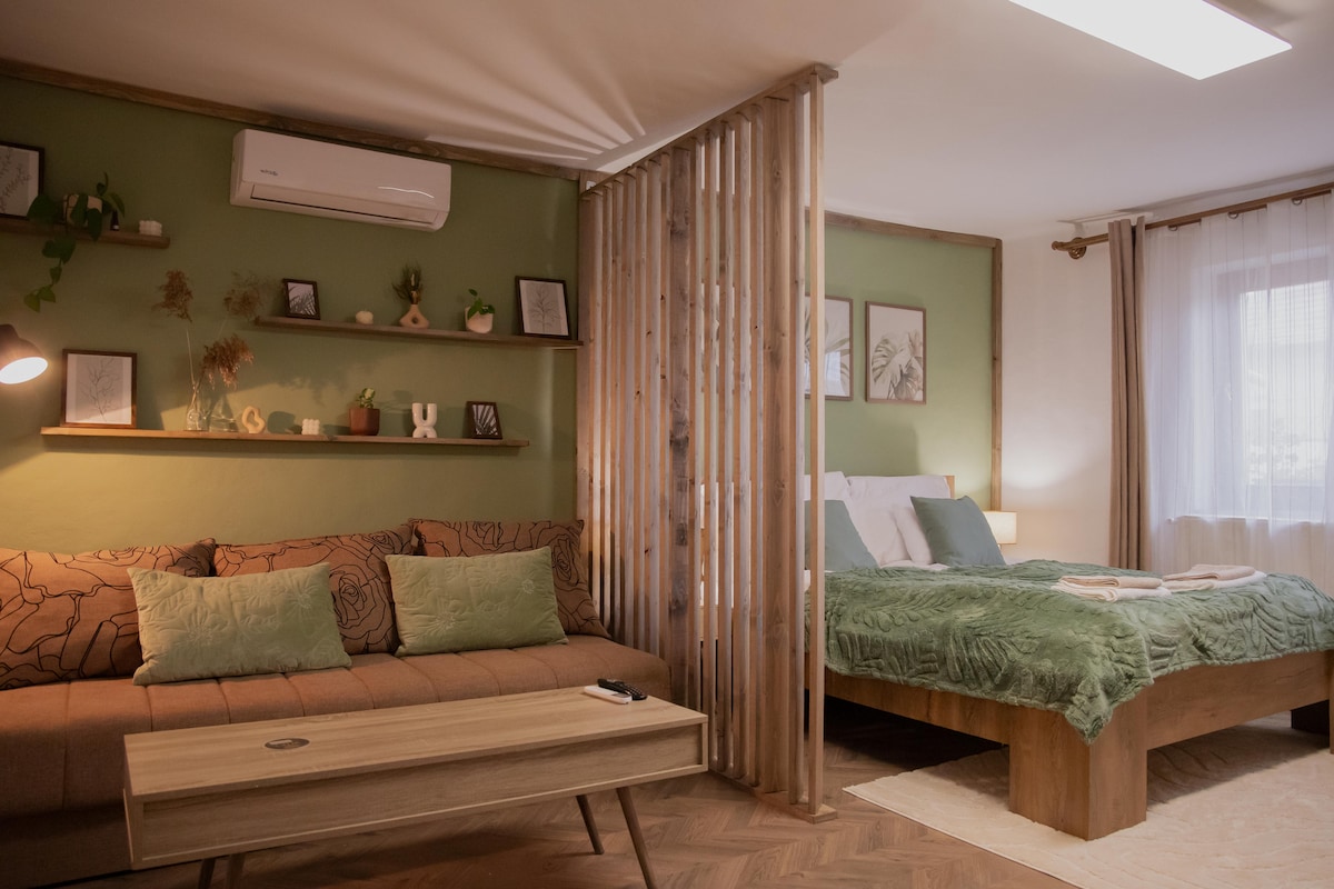 Vendégházunkat szívvel-lélekkel terveztük és saját kezünkkel újítottuk fel, hogy egy valóban otthonos, természetközeli pihenőhelyet teremtsünk. A belső terek színvilága és elrendezése a természet ritmusát követi, miközben a praktikumról sem feledkeztünk meg. Két különálló szoba, egy tágas nappali franciaággyal, külön konyha és fürdőszoba biztosítja a kényelmet. A hatalmas terasz és a kinti főzési lehetőség pedig lehetőséget ad a szabad levegőn való közös élményekre és kikapcsolódásra.