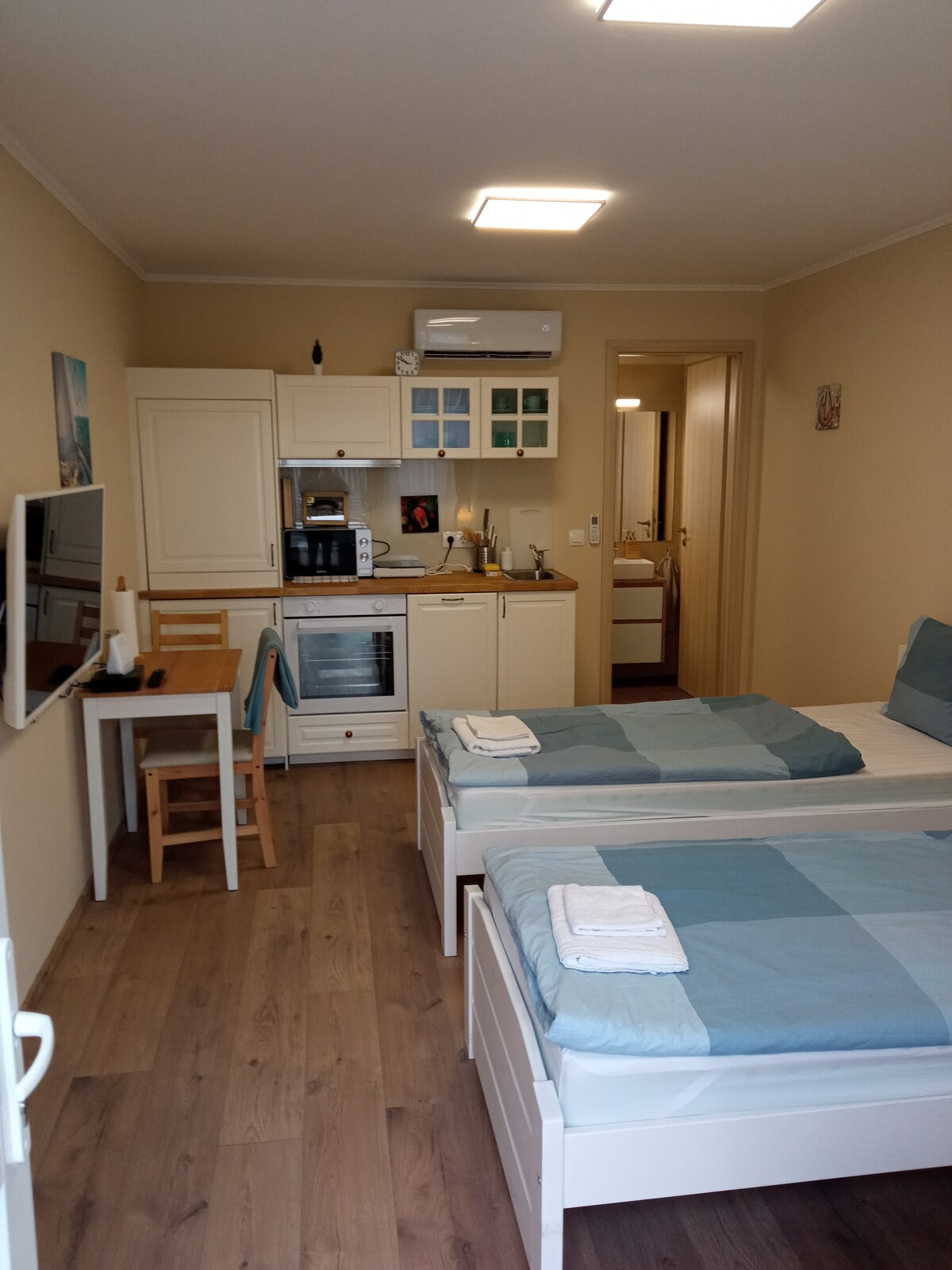 Régi műemlék épületben, nagy belmagasságú polgári lakás, stílusosan berendezve, minden kényelemmel. Belvárosi saját parkolós apartman, közvetlen kapcsolattal a sétáló utcára, 100 m-re a vártól, 200 m-re a strandtól, éttermek, szórakozó helyek, kávézók, bárok között. Ideális családoknak 1 vagy 2 gyermekkel, pároknak. A szállás 4 felnőtt részére nem igazán alkalmas, mivel az egyik ágy csak egy kihúzható kanapé. Az apartman csak teakonyhával rendelkezik, ami főzésre nem alkalmas.