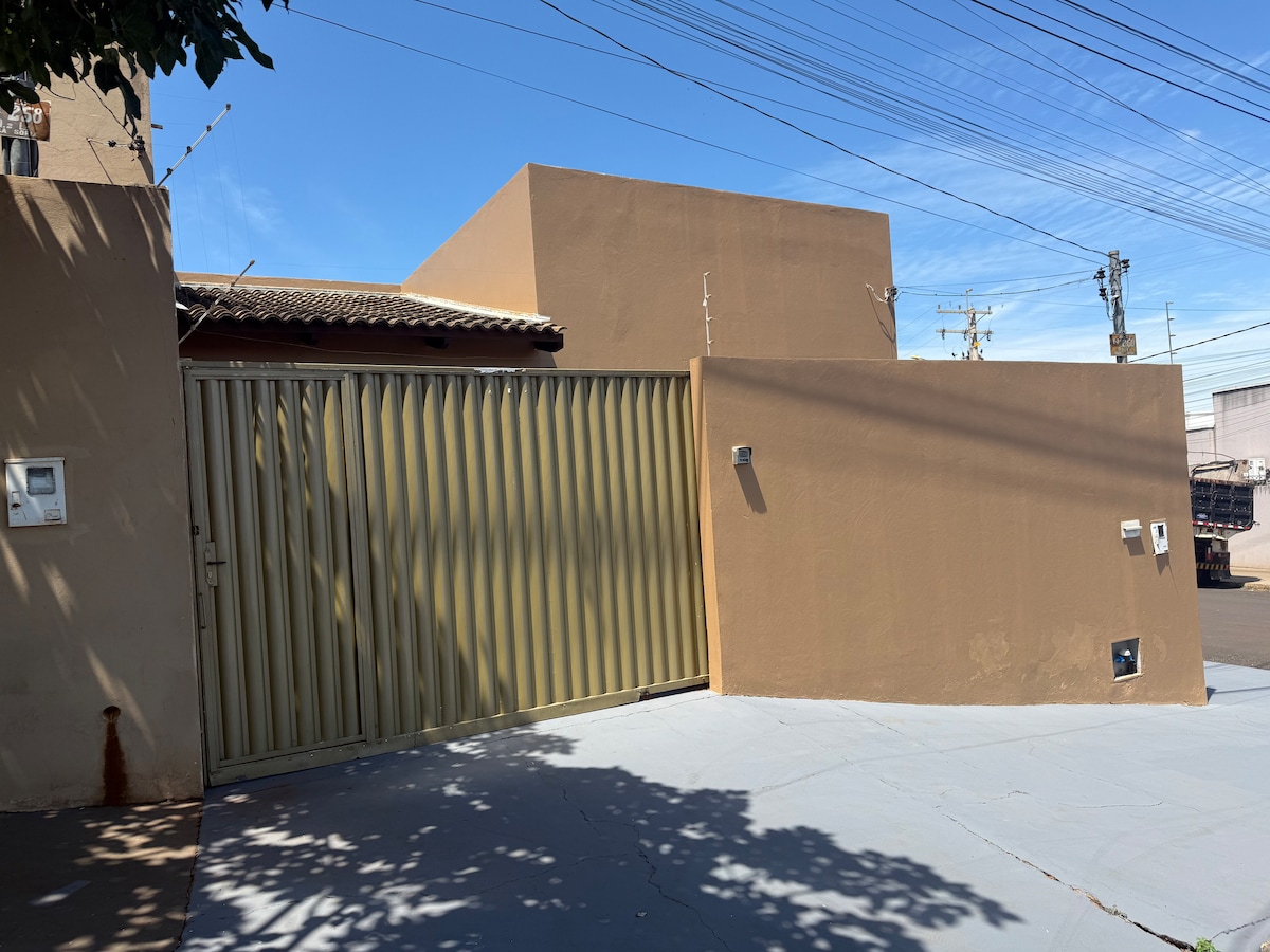 Casa aconchegante, c/ espaço privativo, em bairro calmo, fica 2 minutos do shopping, está próxima à supermercados, restaurantes, farmácias, postos de gasolina, hospitais e à saída da cidade pelo anel viário. A mesma possui sala c/ sofá cama, cozinha equipada (microondas, airfryer, pipoqueira, panela de pressão elétrica, bebedouro para água mineral e utensílios), 2 quartos sendo: 1 c/ ar condicionado, 1 cama de casal e 1 cama de solteiro; e outro c/ ventilador e cama casal. Toalhas e lençóis.