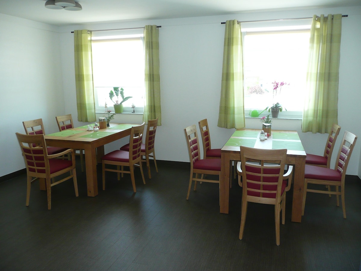 Fünf moderne Zimmer, mit kostenlosen Parkplatz, W-Lan ,Telefon ins deusche Festnetz, Frühstück im Preis NICHT inclusive großem LED Fernseher, Bad ,Dusche WC