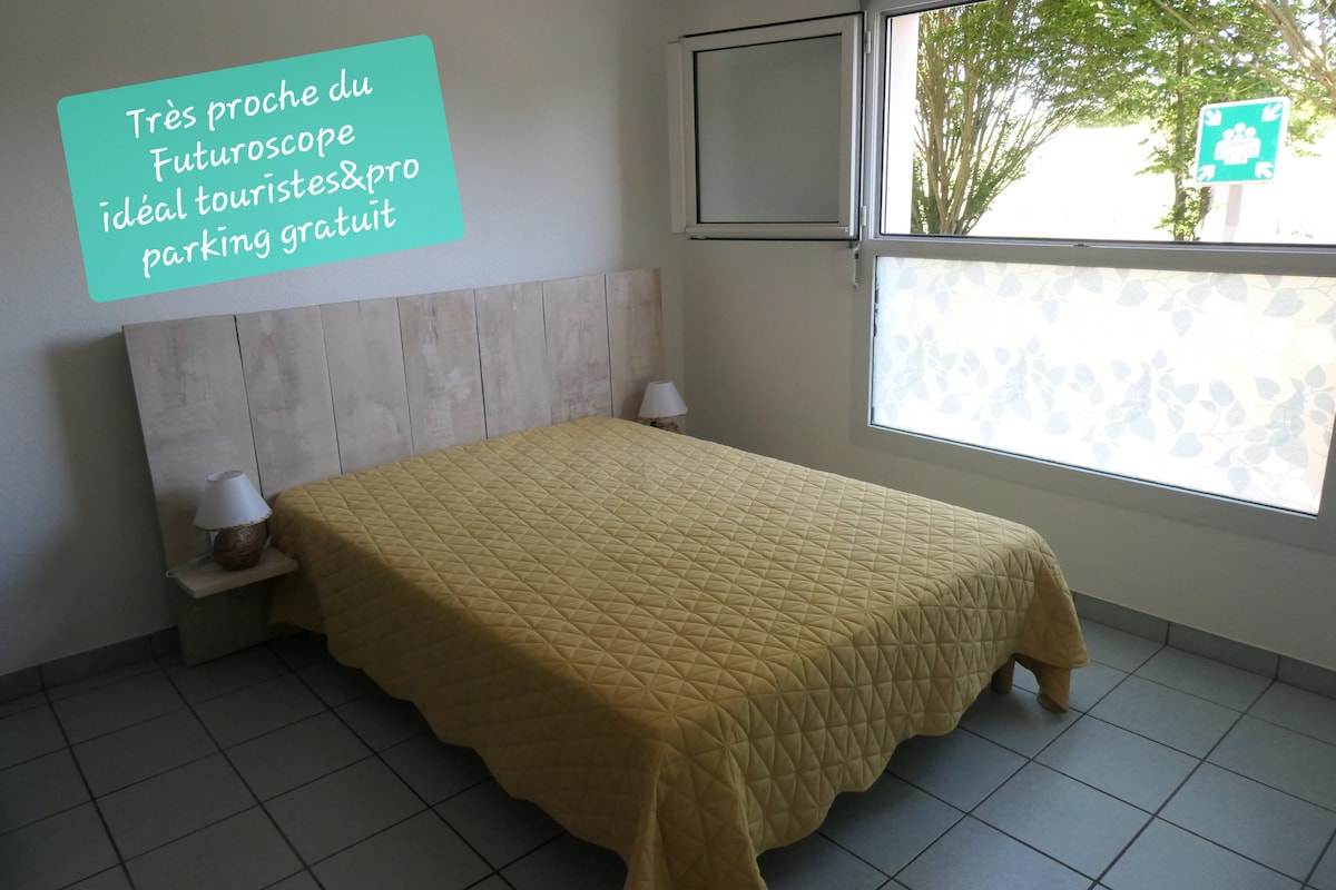 Détendez-vous dans ce logement calme et élégant, Classé de meublé de tourisme ☆ Studio de 27 m² entièrement rénové et équipé pour vous apporter un maximum de confort pouvant accueillir jusqu'à 4 personnes. Situé à 8 minutes à pieds du parc du Futuroscope, de l'Aquascope et de son Arena. Résidence calme et sécurisée avec digicode et parking privatif. Accès rapide depuis l'A10-sortie 28. Arrivée et départ autonome (boite à clé) Zone commerciale à proximité, moins de 5 minutes en voiture.