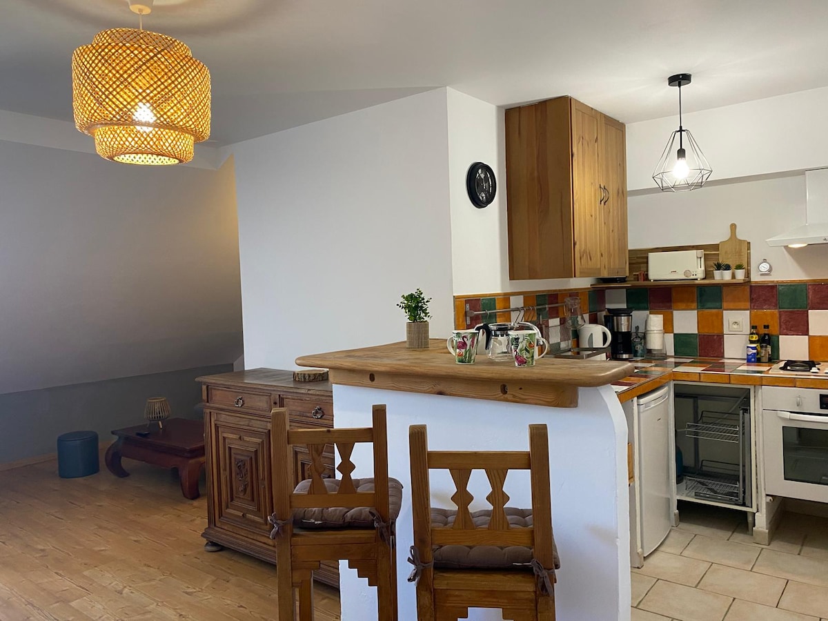 Appartement dans petit village avec 1 chambre, séjour avec clic clac. cuisine indépendante bien équipée, SDB et WC séparés, un balcon et une tropézienne. exposition sud-ouest ,très lumineux, vue sur les montagnes et coucher de soleil.. Au 3 ème étage sans ascenseur. Parking privé devant l’immeuble. Principaux commerces et plan d’eau à 3 minutes à pied. : lave vaisselle ~ lave-linge - grille-pain. Senséo - petit congélateur Télévision et dvd Lit pour bébé