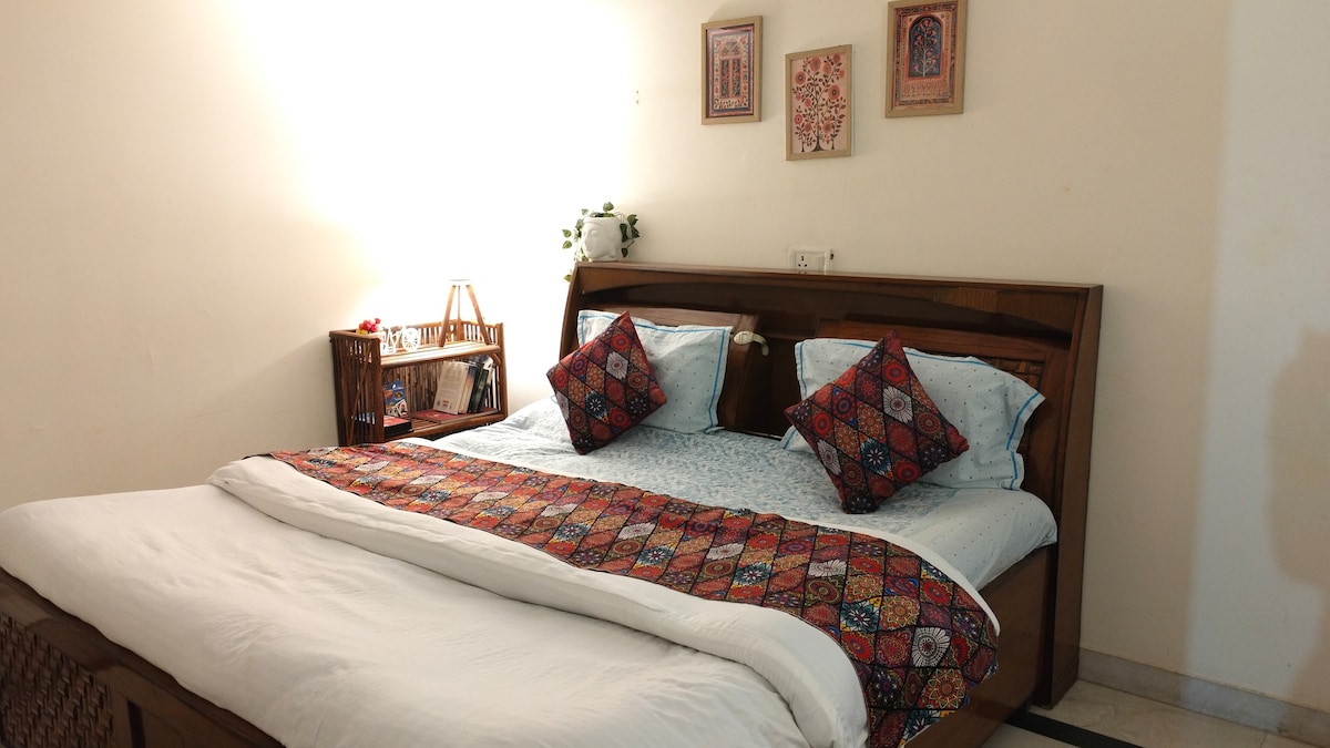 Stay at our spacious 2BR Park-View Retreat, 8.5 km from airports & 15 min ride to the metro. Enjoy airy balconies, park views, mahogany/wooden beds, a fully-equipped kitchen, high-speed Wi-Fi, Smart TV, complimentary toiletries, & local recommendations. Relish home-cooked meals, explore nearby market & malls, and unwind with serene jogging paths. Experience top-notch hospitality with flexible check-in/out, laundry services & optional airport transfers. Book now for a memorable Delhi stay!