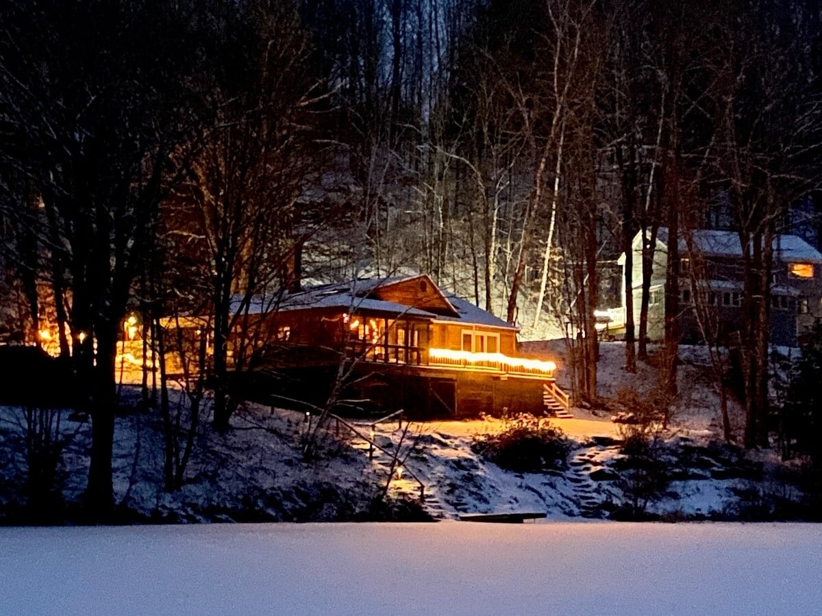 Karsten's cabin is brand new 4 bedroom/2 bathroom house directly on the lake with private, wooded mountain views. Centrally located between Stowe and Jay Peak, your group won't run out of opportunities to enjoy the beautiful nature of Vermont in all seasons! Walk down to the lake for a swim, canoe ride to loons, enjoy the views from the oversized deck, make s’mores at the campfire, or soak in the hot tub on the covered porch. Winter sports galore with⛷️ 🏂, dog sledding, snow shoeing near by!