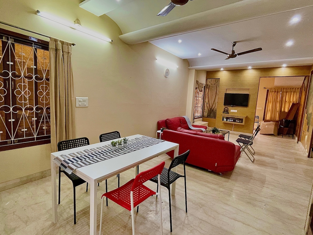 Welcome to our newly renovated, spacious 1-BHK flat, ideal for couples and families seeking comfort and convenience. The bedroom boasts a queen bed and soft orthopedic mattress for a restful night's sleep. Relax in the large living room with a 43-inch Smart TV, lightning-fast WiFi and dedicated workspace. Comes with a super clean bathroom stocked with essentials. The fully equipped kitchen includes basic ingredients, high-quality appliances, and crockery for your culinary adventures.