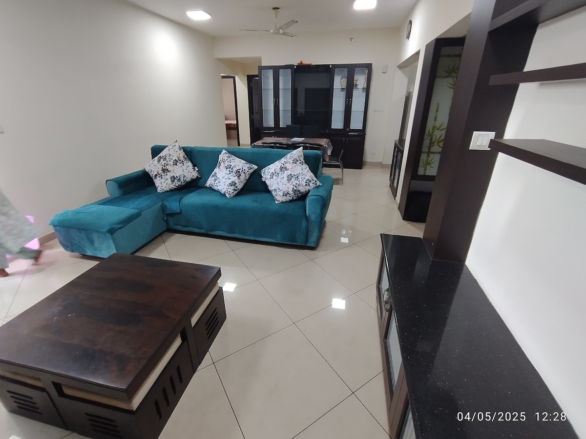 Welcome to our cozy 2 BHK flat nestled in a serene hotspot of Bangalore. Enjoy the tranquility of this quiet retreat, equipped with an AC (in one bedroom) for comfort. Stream seamlessly with up to 100 Mbps WiFi and conveniently park your car & bike hassle-free. Savour complimentary tea and coffee as you unwind on premium mattresses dressed in quality linens. We've got you covered with provided shampoo and body gel for a worry-free stay. Experience comfort and convenience at its best!