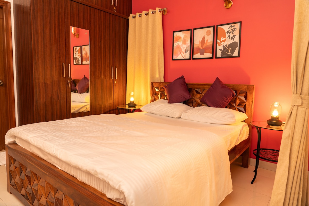 Welcome to our newly renovated, spacious 2BHK flat, ideal for couples and families seeking comfort and convenience. Each bedroom boasts queen beds and soft orthopedic mattresses for a restful night's sleep. Relax in the large living room with a 43-inch Smart TV, lightning-fast WiFi and 24-hour power backup. Comes with two clean bathrooms stocked with essentials. The fully equipped kitchen includes basic ingredients, high-quality appliances, and crockery for your culinary adventures.