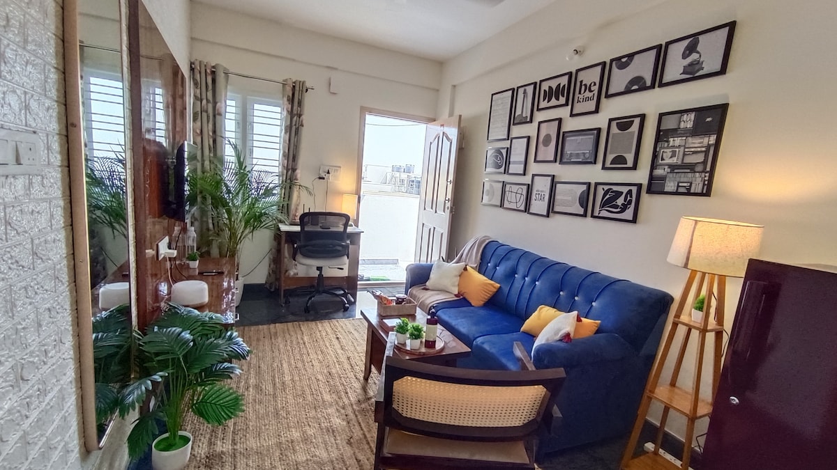 Experience living in the heart of Koramangala at our stylish modern penthouse with - A spacious open terrace—perfect for morning coffee or evening cocktails. - A fully equipped kitchen with * Cutlery, plates and glasses * Cooking pans * Electric stove * Hot water kettle * Air Fryer * Refrigerator * Toaster * Blender - Cozy interiors * Double bed king sized * Reading table * Garden table and chairs * Arm chairs * Bar counter and chairs - Ideal for * Couples * Solo travelers