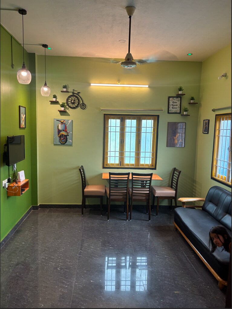 A newly renovated 2 BHK with A/C, tasteful furniture, lighting, brand new amenities @ heart of the city, a peaceful, residential location. We aspire to provide friendly, clean, affordable stay. Hall : Sofa, Diwan, 43" LED TV, DTH, Wifi Dining : 4 seat table cum workspace Bedroom (2) : 2 Queen size beds, 2 floor mattress , A/C, Window cradle hanger Kitchen : Fridge, Induction stove, Basic utensils Bathroom (2) : Liq soap, Geyser, Western toilets Utility : Washing m/c, UPS, Cloth drying stand