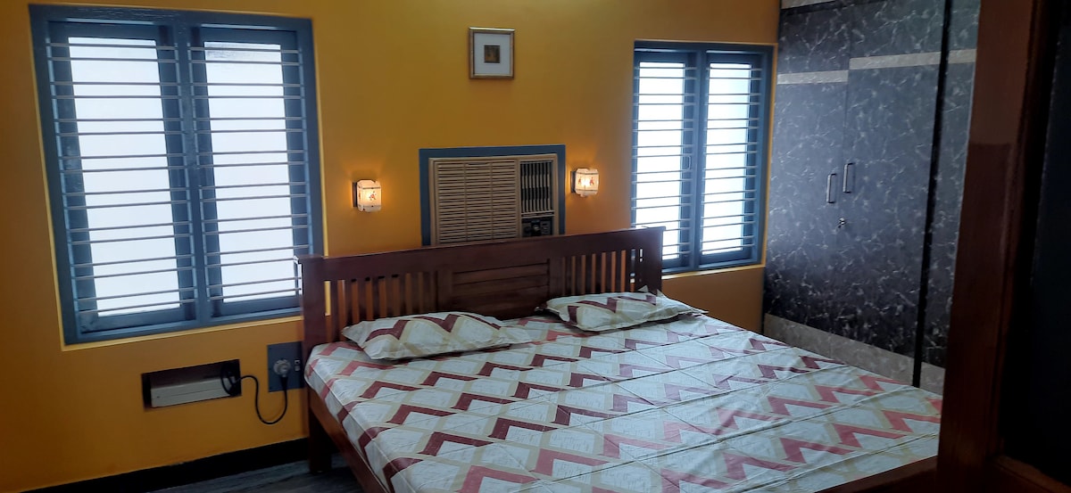 Not Just a Stay – Feel at Home in Kumbakonam! 🌿 Enjoy a cozy homestay near Kumbakonam’s famous temples with AC, Wi-Fi, kitchen, secure parking, and a private balcony. The bedroom has a king-size bed for 2 adults and 1 child. Extra mattress available on request at additional cost, payable at the homestay. Bathroom includes both Indian and Western toilets. Temple visits, pick-up/drop, and sightseeing can be arranged.