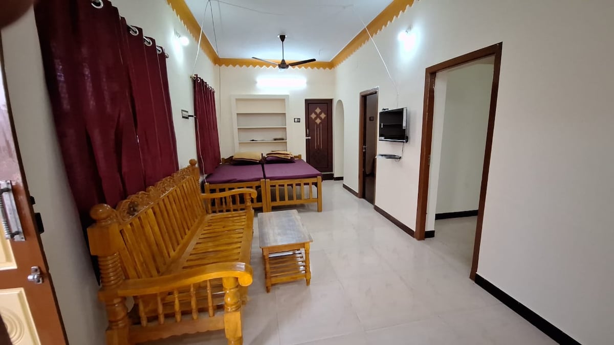 Peaceful cozy private studio on 2nd floor in prime Thanjavur location—1 km from railway station/old bus stand, 4 km from new bus stand, 3 km from UNESCO Brihadeeshwara Temple. Features A/C, double bed, TV, mini fridge, kitchenette, hot water, wardrobes. Solar-powered with battery backup. Enjoy terrace garden, homemade food (on request), free toiletries, local travel help, and safe driver/travel recommendations. Ideal for temple visits in ana around Thanjavur/Kumbakonam and relaxing stays.