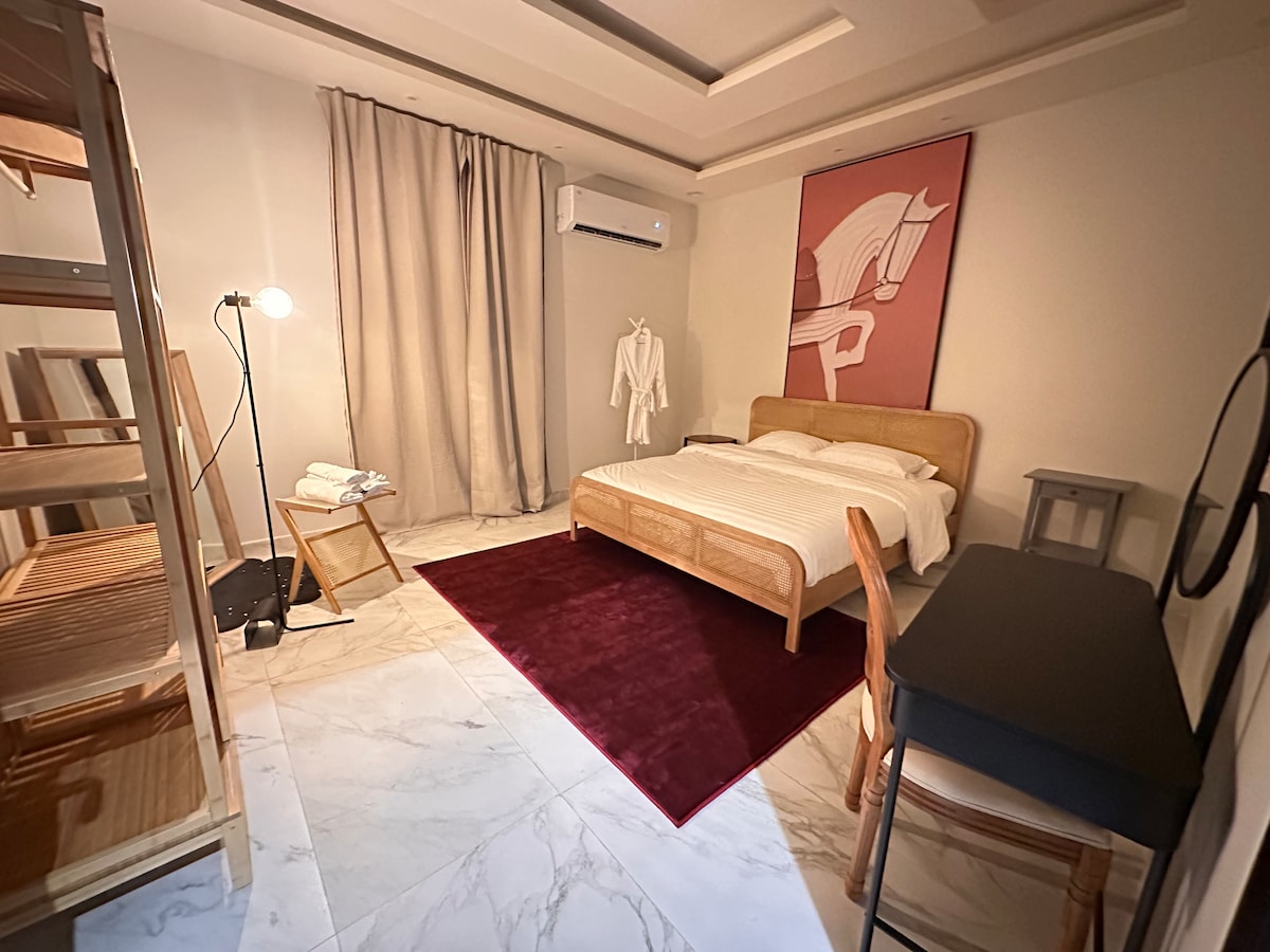 استديو مصمم خصيصا لراحتكم بسرير ماستر وجلسة أنيقة ودخول ذاتي الغرفة تحوي على كنب يتحول إلى سرير عند الحاجة وتلفزيون. السرير يحتوي على لباد 20 سم لتجربة فريدة من الإحساس بالراحة والنعومة بالإضافة إلى لحافات وأغطية يتم غسلها وتبديلها بعد كل عميل. ركن قهوة وثلاجة ودورة مياه تحوي على دش مطري وكرسي معلق. بالقرب من المكان مقهى فيرو وسوبر ماركت ومطاعم عديدة وحديقة يوجد انترنت مفتوح عالي السرعة. نوفر طريقة الدخول بالبطاقات لمن يحب.