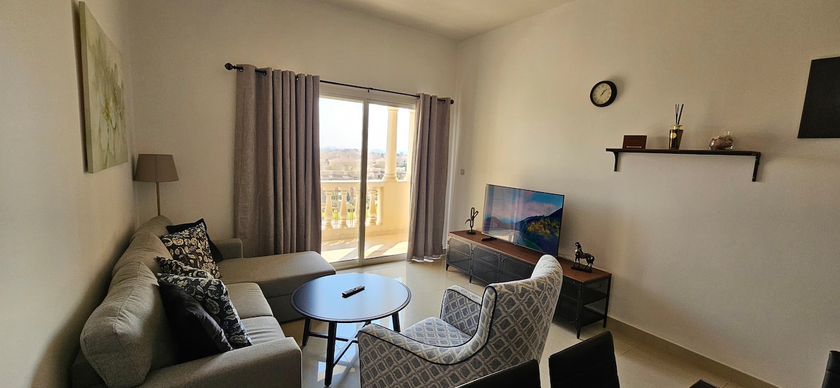 Fully renovated one-br suite steps from the free Beach, Golf course, Marina and close to luxury hotels Ritz Carlton, Waldorf, Hilton. 20 m. drive to Hajar Mountains. 24 hours Concierge/lockbox access. Free Parking. Free: Gym, pool ,kids pool and 2 kids play areas . Gorgeous large terrace with lounge seating and full sea view. Sleeping: 1 King size bed+ 2 sofa beds. Kitchen: cooker, w/machine, Fridge, Nespresso, toaster. Other: Wifi, 55' Smart TV , Netflix, beach towels, umbrella