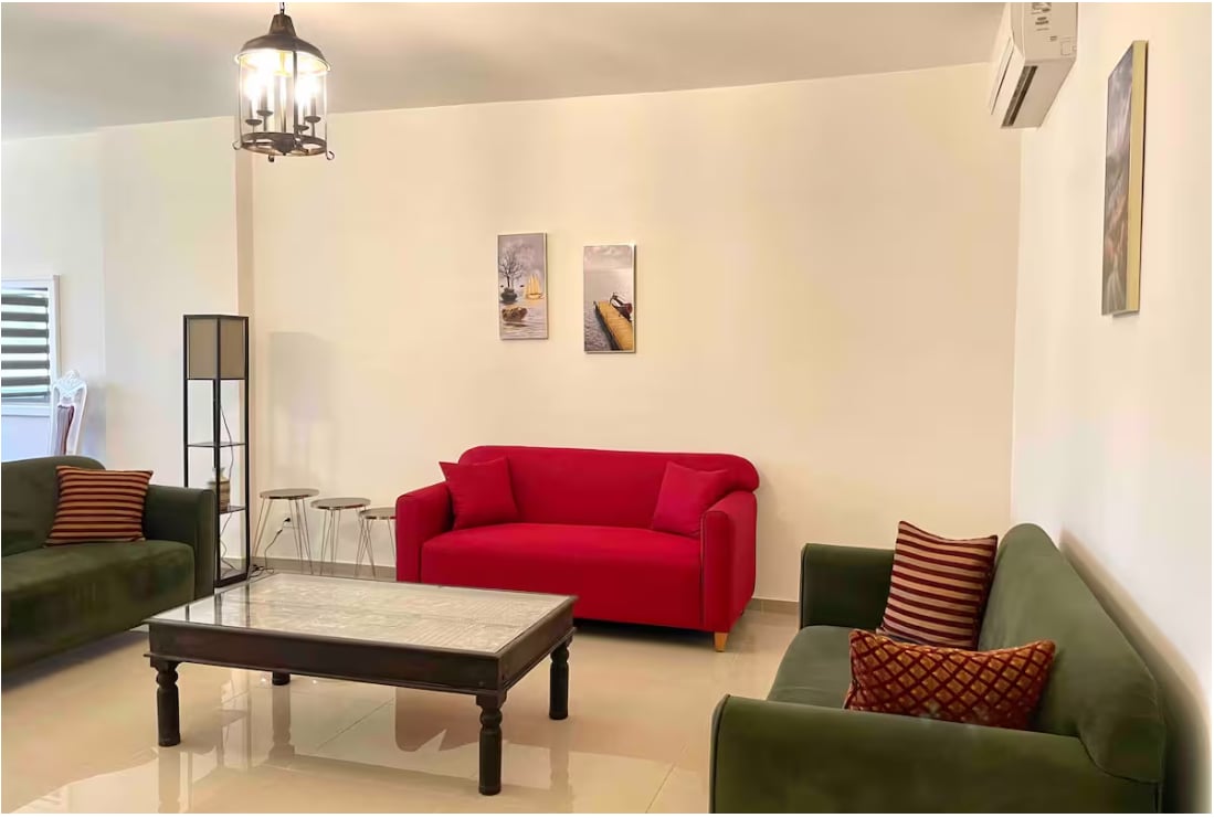 Cosy & comfortable, beautiful place, big and spacious. • 1- min by car to the beach, or 3-min walk. • in the heart of Byblos. • 10-minute drive to Batroun. • Large apartment / 120 m². • Fully equipped kitchen. • 2 bedrooms: one Master & two single beds. • 2 bathrooms. • Smart TV & cosy living area. • Dining table for 6 persons. • 1 free parking space. • Electricity 24/7. • AC in bedrooms. • AC in living room (extra charge).