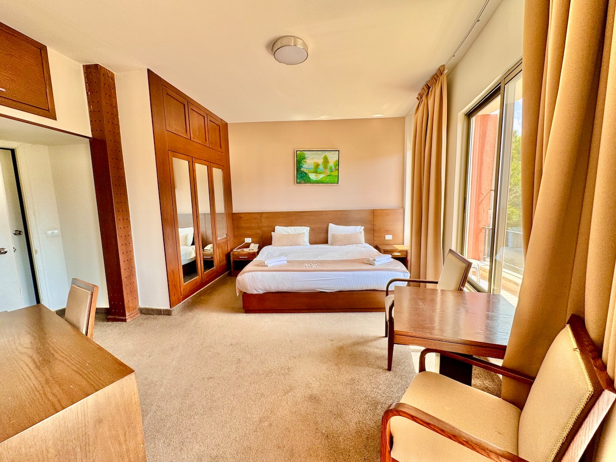 Pleasant and spacious room with Queen size bed or twin beds, 40m2, features modern and luxurious furniture, sitting area with 2 comfortable armchairs, desk, kitchenette, tea and coffee, mineral drinking water &free Wi-Fi.