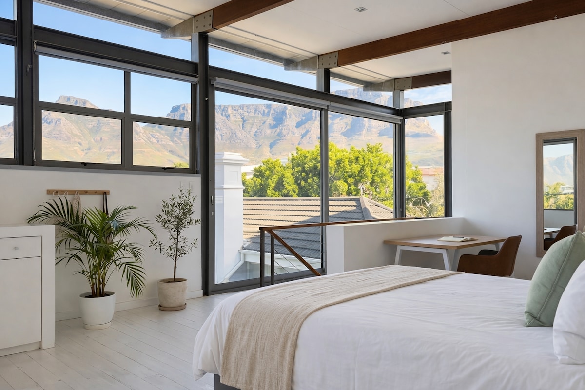 Our studio apartment opens up onto a 40sq meter balcony with a panoramic view of the Hout Bay Valley and the Helderberg mountains beyond. Large sliding doors disappear into the walls creating an unimpeded indoor/outdoor flow while the elevated position protects your privacy. The open plan bathroom faces onto an enclosed secret garden which includes a frame-less glass shower. The unit has a fully equipped kitchenette and is serviced daily except weekends and public holidays.