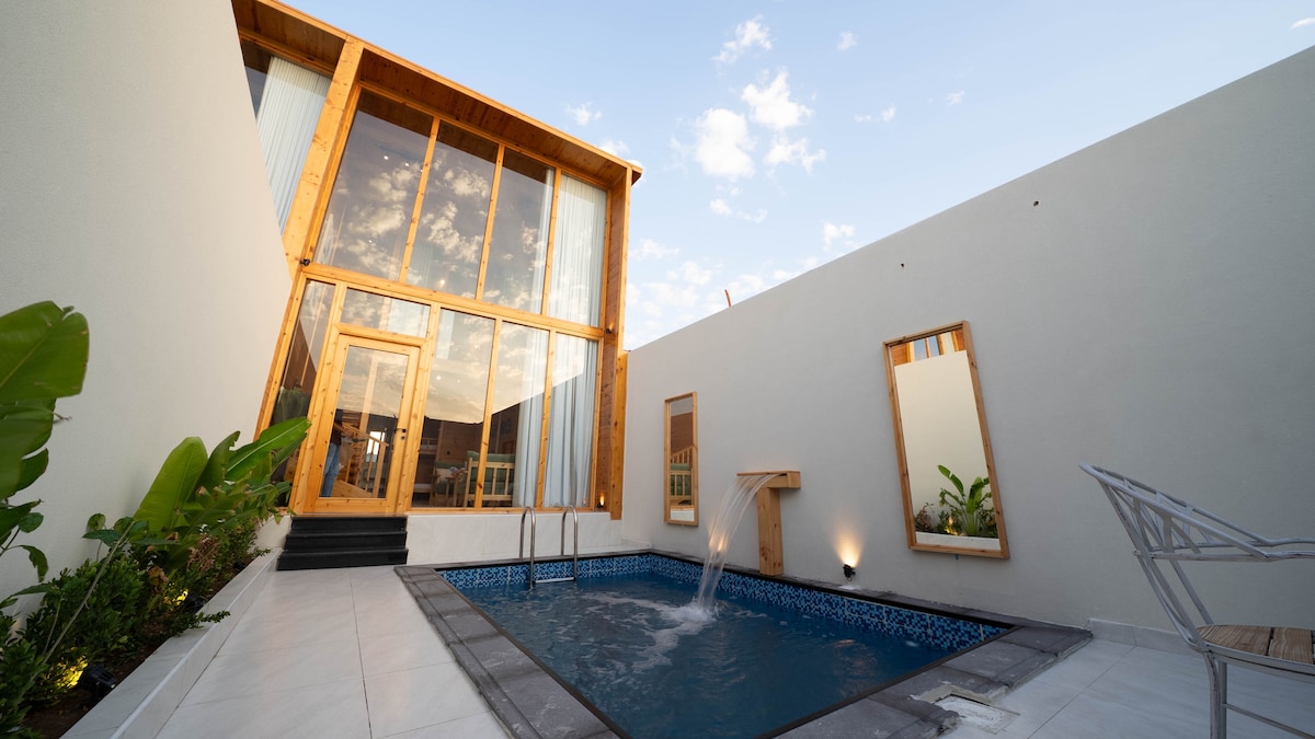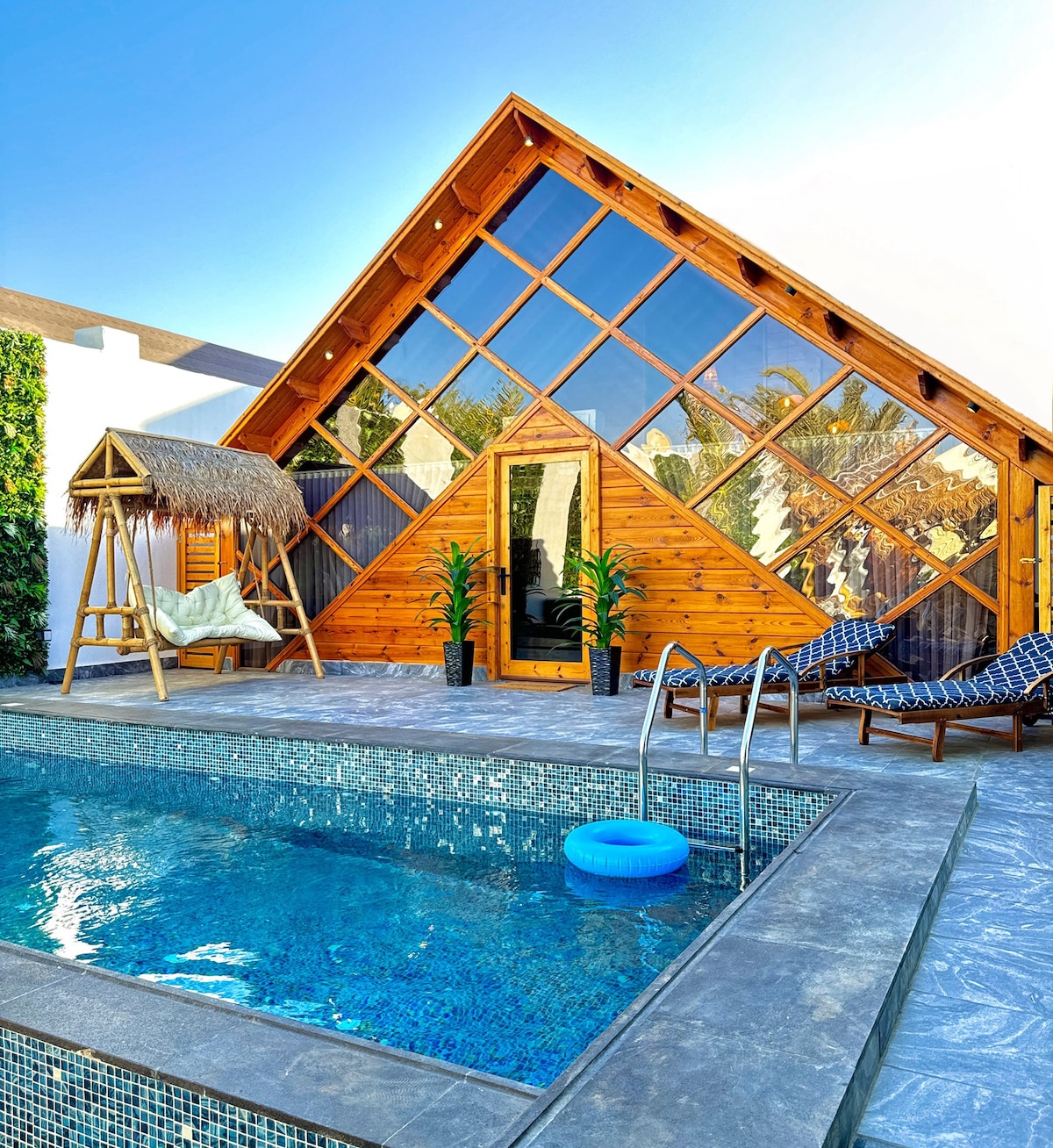 كوخ خشبي راقٍ مكوّن من دورين بتصميم مستوحى من الأكواخ الجبلية، بإطلالة بانورامية على المسبح الخارجي. يتكون من: غرفة نوم رئيسية بسرير ماستر . غرفة نوم إضافية تحتوي على سرير دورين. صالة معيشة بإطلالة جميلة على المسبح، بمجلس مودرن وشاشة سمارت. مسبح خارجي للكبار متدرج العمق بدون حاجز مطبخ متكامل يحتوي على ثلاجة، بوتاجاز، مايكروويف وغلاية. واي فاي وسماعة مناسبة للجلسات