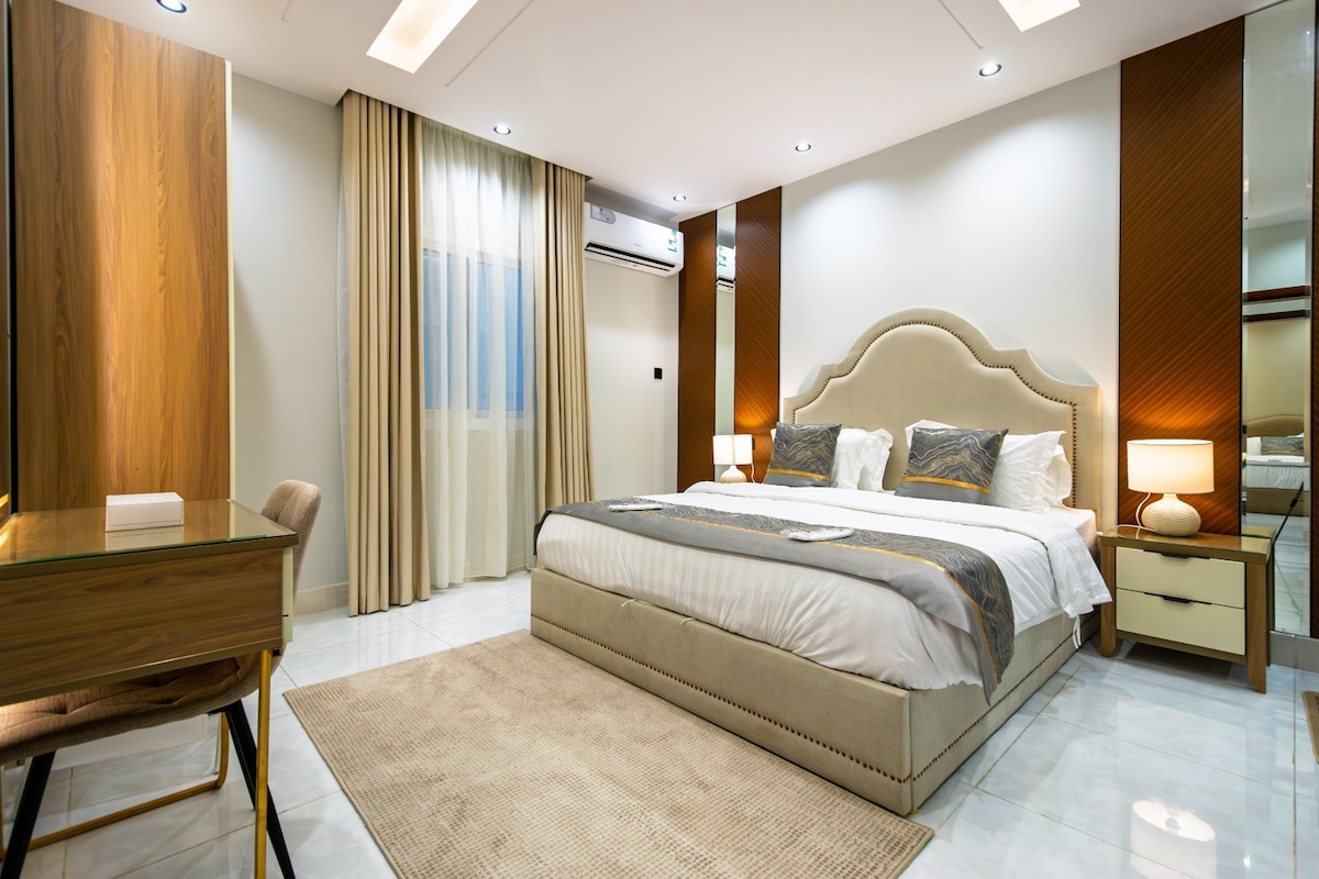 Experience unparalleled luxury in this uniquely designed apartment in Jeddah City. Located just 5 minutes from the airport and near Arab Mall, this apartment includes a master bedroom with a king bed featuring a very special German-made mattress for ultimate comfort. It also boasts a luxurious massage chair,and parking. The interior is beautifully styled, offering an exclusive retreat that promises an exquisite and unforgettable stay.