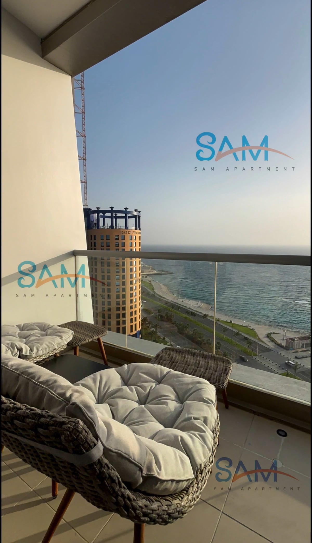 "استمتع بإقامة فاخرة على شاطئ البحر! شقة رائعة للإيجار اليومي تتميز بإطلالات خلابة على البحر من كل زاوية. تتكون الشقة من غرفتي نوم مريحتين وصالة، حيث تحتوي غرفة النوم الرئيسية على بلكونة خاصة تطل على البحر، مما يوفر لك لحظات من الاسترخاء والهدوء. والاستمتاع بالمناظر البحرية الساحرة من بلكونة الغرفة الثانية وصالة المعيشة. تتميز الشقة بالأثاث العصري والديكور الأنيق، وتضم جميع وسائل الراحة الحديثة التي تحتاجها. "لا تفوت هذه الفرصة لتجربة إقامة لا تُنسى في واحدة من أجمل المناطق على شاطئ البحر".