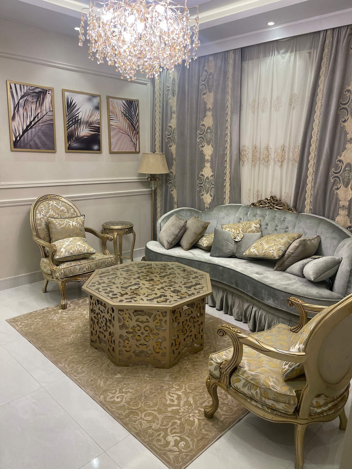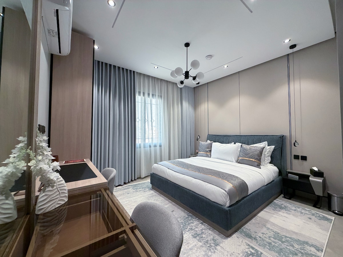 A modern studio with a refined design offering comfort and privacy, featuring smart self check-in. Includes a king-size bed, elegant seating, massage chair, full kitchen, and a luxurious bathroom with Jacuzzi. Hotel-style cleaning is available upon request. Smart use of space, stylish furniture and calming touches. Located 5 mins from Jeddah Airport. Fast Wi-Fi, 75” TV, free Netflix. Quiet building with elevator and private parking. Everything you need for a perfect stay.