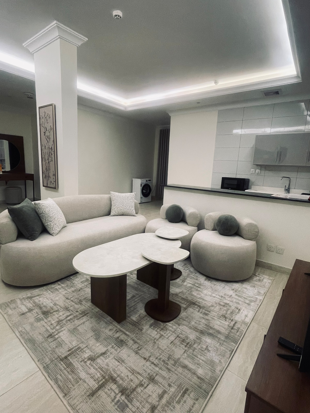 A modern studio with a refined design offering comfort and privacy, featuring smart self check-in. Includes a king-size bed, elegant seating, massage chair, full kitchen, and a luxurious bathroom with Jacuzzi. Hotel-style cleaning is available upon request. Smart use of space, stylish furniture and calming touches. Located 5 mins from Jeddah Airport. Fast Wi-Fi, 75” TV, free Netflix. Quiet building with elevator and private parking. Everything you need for a perfect stay.