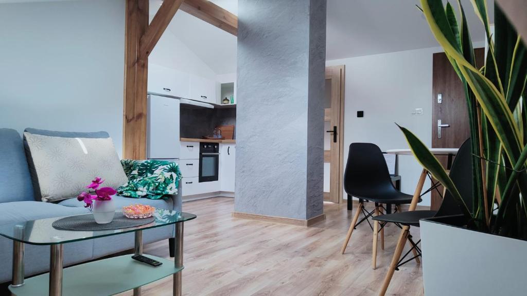 Zapraszamy do przytulnego apartamentu na poddaszu, idealnego dla maksymalnie 4 osób. Do dyspozycji gości są: - 2 oddzielne sypialnie, - jasny salon z aneksem kuchennym - nowoczesna łazienka - bezpłatne Wi-Fi i klimatyzacja. Apartament jest nowocześnie urządzony i w pełni wyposażony, dzięki czemu zapewnia wygodę zarówno na krótszy, jak i dłuższy pobyt. Położenie w spokojnej okolicy na obrzeżach Jędrzejowa gwarantuje ciszę i relaks, a jednocześnie szybki dojazd do centrum.