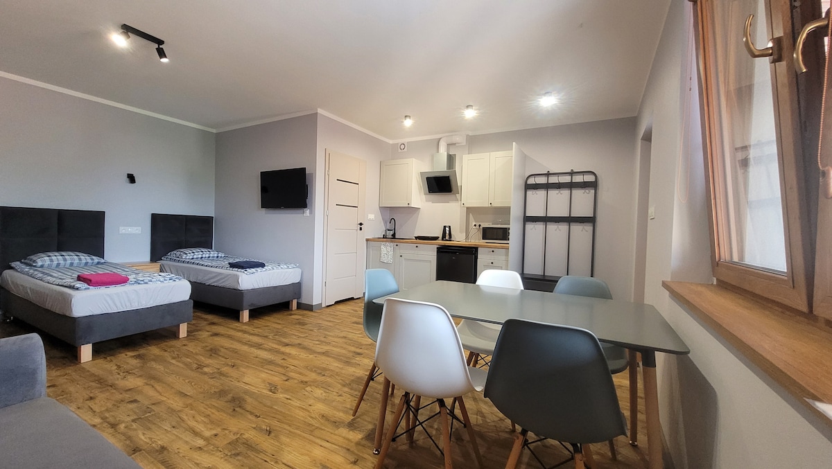 Apartamenty położone na wzgórzu w spokojnej okolicy w otoczeniu łąk z piękną panoramą na okolicę. Parter i piętro domku z osobnymi wejściami, salon klimatyzowany, w pełni wyposażony aneks kuchenny, przytulna sypialnia i łazienka. W sypialni duże wygodne łóżko podwójne, w salonie dwie rozkładane kanapy, w łazience prysznic, płaski TV. Apartamenty nowocześnie i komfortowo wyposażone. Duży, monitorowany parking. Duuużo zielonej przestrzeni. Mały plac zabaw, huśtawki, hamak, leżaki, grill, ognisko.