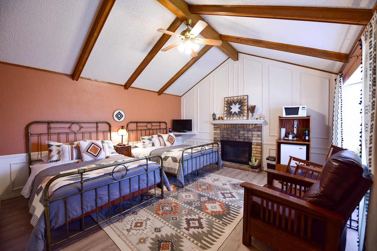 *Newly Renovated* *Fireplace* *Pet Friendly* *Onsite Free Guest Laundry* Decorated in a cozy western style, the room features 2 queen beds, a wood burning fireplace (we provide the logs!), mini fridge, microwave and coffee pot as well as a private bath with bathtub. Butterfield is located in a lush courtyard just off the main street in Fort Davis with just the right amount of privacy and easy walking to shops, restaurants and the historic courthouse and library.