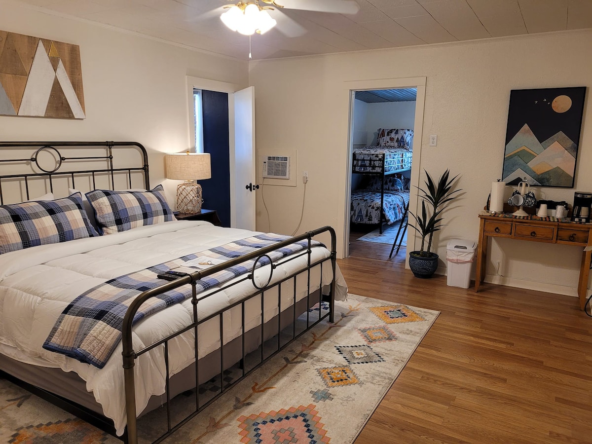 Room #1 at Mountainside Inn features 2 bedrooms. The large main bedroom has a coffee bar, king bed with new Serta Perfect Sleeper mattress, flat screen TV and lots of closet space. The second small room has 2 sets of bunk beds to sleep up to 4 KIDS (these needs are not big enough for adults) with their own TV and space. The 2 bedrooms share a private bathroom with large shower and plenty of towel and toiletry storage.