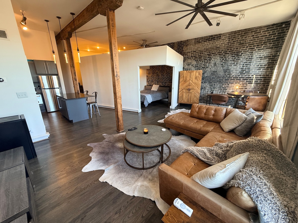 Start your next adventure in our jaw-dropping penthouse loft, and experience a life changing stay where you will be greeted with amazing views of our city. This loft offers a huge open concept feel with beautiful original wood floors and the perfect mix of designer inspired decor. This is the spot you want to stay for all your visits to the Magic City! We are centrally located downtown just a short walk to several award-winning restaurants, parks, stadiums, grocery, and nightlife.
