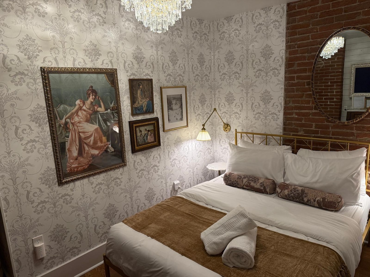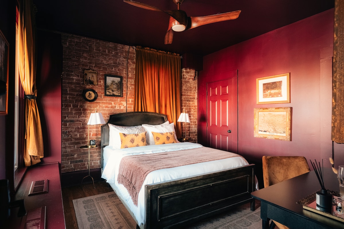 One of our smaller rooms, this cozy single retreat is perfect for embracing the house's historic character. It features a queen bed with soft linens, warm lighting, and a spotless private bathroom with an en suite tub and shower, plush towels, and locally made toiletries. Quiet, compact, and comfortable for solo travelers or couples, the room’s name and theme blend contemporary comfort with the charm of its historic setting.