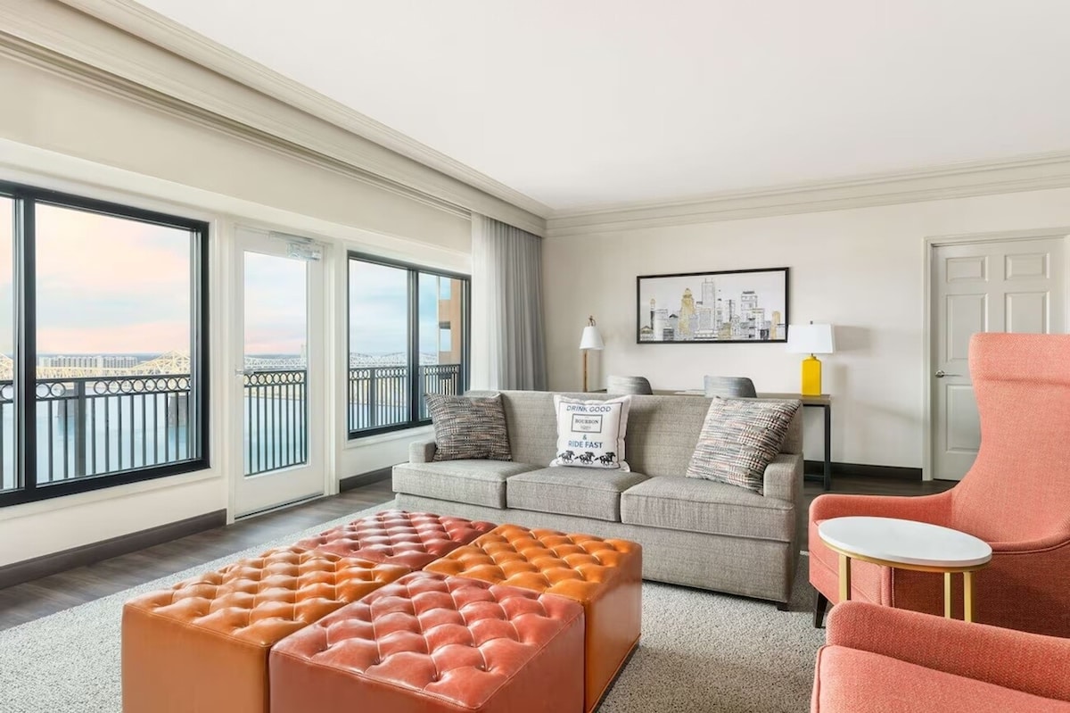 Nestled on Louisville’s iconic riverfront, The Galt House sits between the arts district and downtown entertainment through its Skywalk access. The West Tower Deluxe Room includes two queen beds and contemporary touches, accommodating families or small groups with ease. It’s all about convenience—steps from museums, bourbon tasting rooms, and riverside walks.
