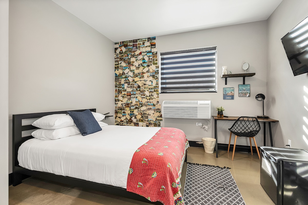 Pilot 3 is located on the second floor and offers a budget-friendly stay with: • Queen bed • TV and desk • Half bath en suite (toilet & sink) Two shared shower rooms are conveniently located just outside for the four Pilot rooms. Guests who prefer a full private bath can choose one of our Captain Rooms on the first floor. All guests can enjoy a large community space with a kitchen and activities, as well as seasonal access to the swimming pool.