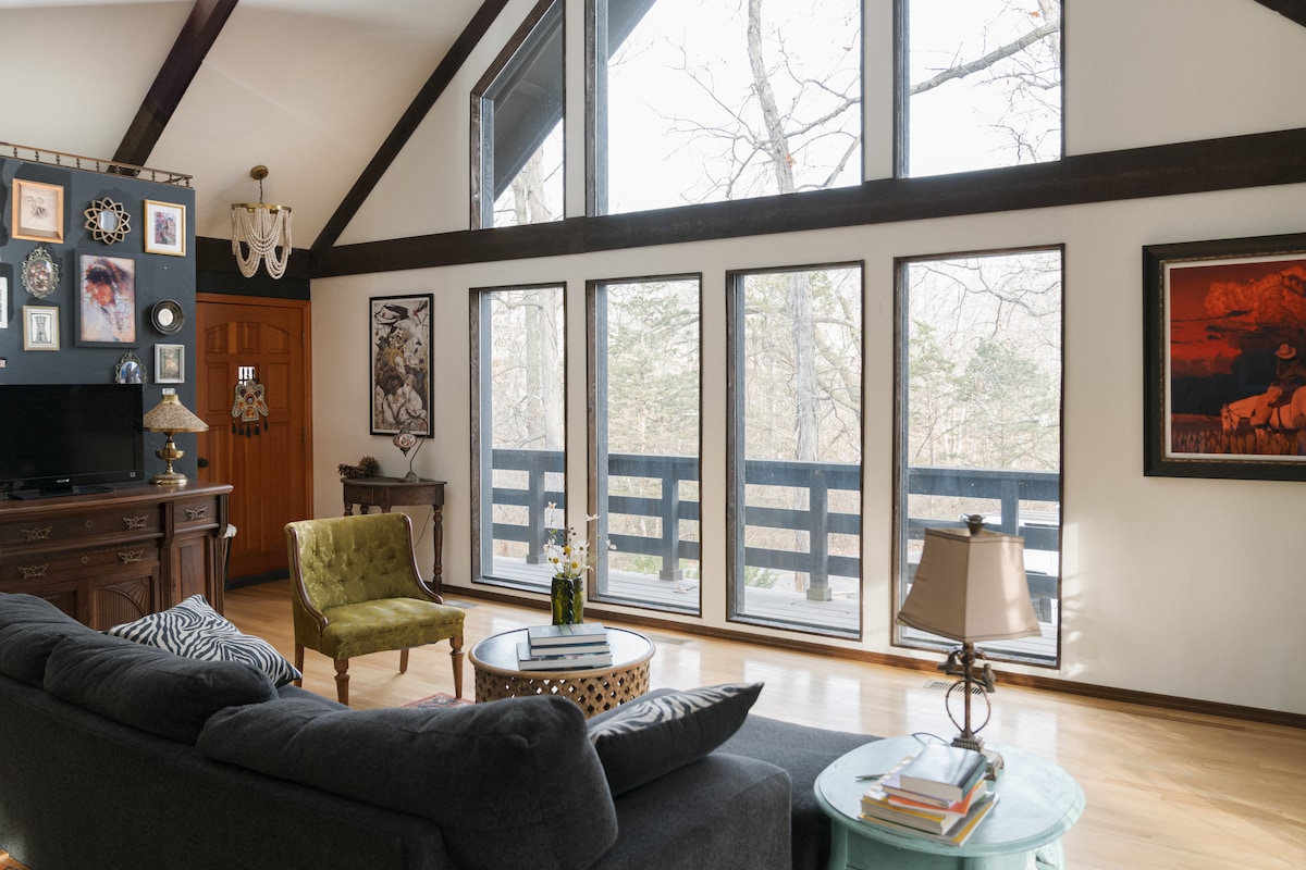 Take it easy at this unique and tranquil getaway. Enjoy a detox in our handcrafted sauna, or take a soak in the hot tub under the stars! Full kitchen, bathR w/claw foot, & screened in porch. It’s very private, with land to explore. Take a stroll to the pond or creek where you will see a little piece of history, or possibly enjoy a visit from our sweet cows. Close to La Chance winery, Desoto town, Big River access points, valley view glades, & Washington state park.