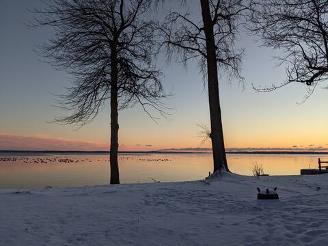 Take a break and unwind at this peaceful oasis. Newly renovated waterfront cottage on Chaumont Bay with breathtaking sunset views of Lake Ontario. Eventide View sleeps up to 8 with 3 bedrooms and 1.5 baths. Swim, fish, kayak, relax waterside, or snuggle up inside with a book and a blanket next to the fireplace. The large backyard offers plenty of room to play. Guests will also have access to the 1 stall garage. Our waterfront rocky beach has great swimming for kids of all ages.