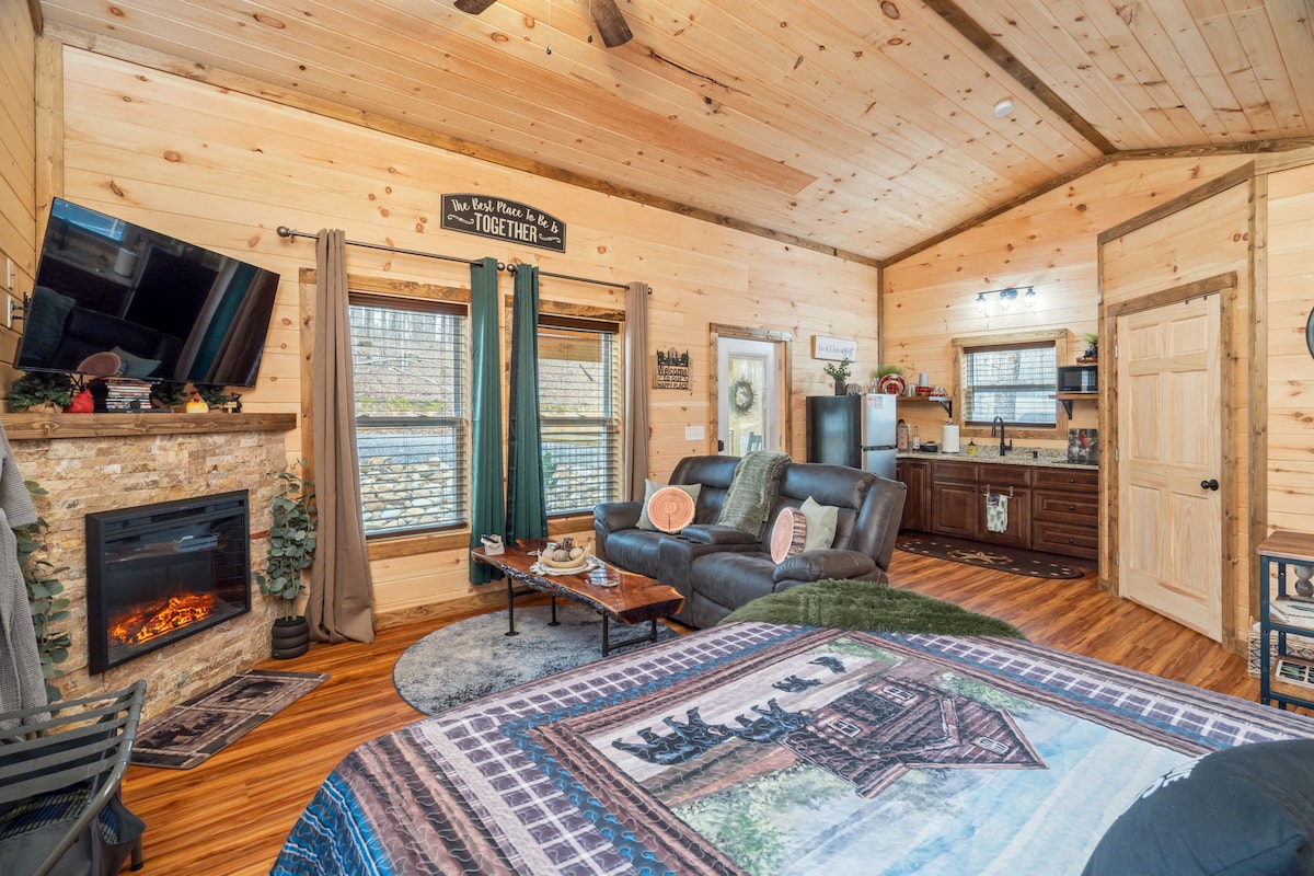 ☆NEW studio cabin☆ Professionally decorated with amazing amenities. ☆Hot Tub ☆Fire Pit ☆Charcoal Grill ☆Smart TV ☆King Bed ☆Electric Fireplace ☆Wi-Fi The cabin's location offers easy access to the Smokies, Gatlinburg, Pigeon Forge & Dollywood, making it perfect for adventurous couples or those seeking a peaceful escape. With thoughtful amenities you’ll have everything you need for a peaceful & relaxing getaway for two. Book now and make unforgettable memories with the ones you love most!